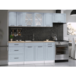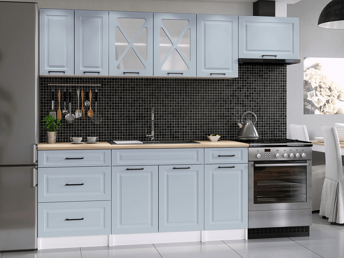 Kuchyňská linka Magda je vyrobená ve venkovském stylu, který se hodí do kuchyně v paneláku i v rodinném domě. Tento styl má jedinečnou schopnost proměnit Vaši kuchyň v útulnou a zároveň funkční místnost, kde bude radost vařit i péct. Kuchyňská linka Magda nabízí dostatek úložného i pracovního prostoru. Všechny skříňky jsou samostatné, takže si je můžete sestavit tak, jak Vám to vyhovuje. Korpusy skříněk jsou vyrobené z lamina 18 mm s hranami ABS a dvířka jsou MDF 16mm. Všechny skříňky jsou dodávány v demontu. Součástí balení je montážní plánek včetně všech potřebných spojovacích prvků. Cena je uvedna za sestavu vyobrazenou na úvodní fotografii BEZ PRACOVNÍ DESKY, s úchytkami, které jsou vyobrazeny v doplňkových fotografiích. Pracovní desku lze dokoupit nad každou skříňku zvlášť podle její šíře. Vyobrazené spotřebiče, dřez, baterie, doplňky a dekorace nejsou v ceně. Kuchyň bude dodaná s bílými korpusy a dvířky ve světle modré barvě. Zobrazení barev na fotografii se může od skutečnosti lišit.