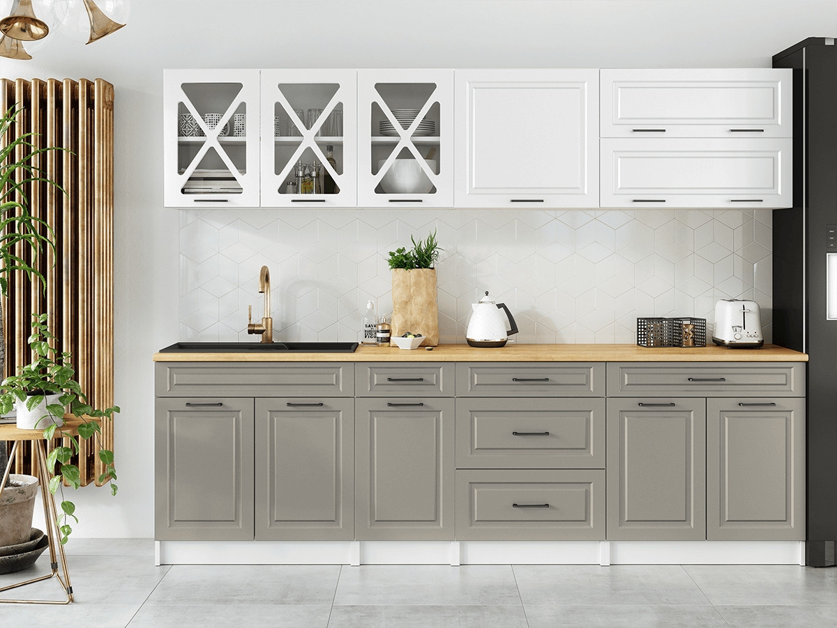 Kuchyňská linka Tyra je vyrobená ve velmi oblíbeném skandinávském stylu, který se hodí do kuchyně v paneláku i v rodinném domě. Tento styl má jedinečnou schopnost proměnit Vaši kuchyň v útulnou a zároveň funkční místnost, kde bude radost vařit i péct. Kuchyňská linka Tyra nabízí dostatek úložného i pracovního prostoru. Všechny skříňky jsou samostatné, takže si je můžete sestavit tak, jak Vám to vyhovuje. Korpusy skříněk jsou vyrobené z lamina 18 mm s hranami ABS a dvířka jsou MDF 16mm. Všechny skříňky jsou dodávány v demontu. Součástí balení je montážní plánek včetně všech potřebných spojovacích materiálů. Cena je uvedena za sestavu vyobrazenou na úvodní fotografii BEZ PRACOVNÍ DESKY, s úchytkami, které jsou vyobrazeny v doplňkových fotografiích. Pracovní desku lze dokoupit nad každou skříňku zvlášť podle její šíře. Vyobrazené spotřebiče, dřez, baterie, doplňky a dekorace nejsou v ceně. Zobrazení barev na fotografii se může od skutečnosti lišit.