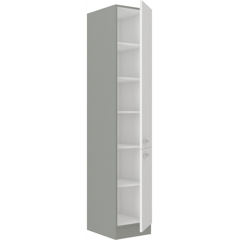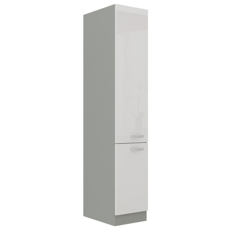 Vysoká kuchyňská skříň je vyrobena z lamina tloušťky 16 mm bílé lesklé barvy a bude dalším krásným kouskem z této kuchyňské série. Korpus skříňky je v šedém provedení. Uvnitř skříně najdete pět praktických polic k uložení všeho co v kuchyni potřebujete uskladnit. Na dvířkách jsou kovové úchytky (délka 135mm) a dveře jsou vybaveny systémem tichého zavírání. Skříňka je vyrobena z kvalitních MDF desek. Poskládejte si z naší bohaté nabídky skříněk moderní a designovou kuchyň podle Vašich představ. V doplňkových fotografiích najdete pro inspiraci fotky kuchyní, které jsou z těchto skříněk sestaveny. Skříňka je dodávaná v demontu. Součástí je montážní plánek včetně všech potřebných spojovacích materiálů.