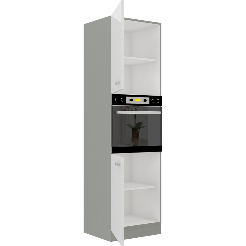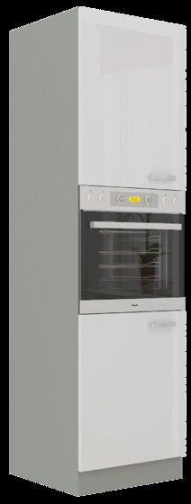 Vysoká kuchyňská skříň je vyrobena z lamina tloušťky 16 mm bílé lesklé barvy a bude dalším krásným kouskem v této kuchyňské sérii. Korpus skříňky je v šedém provedení. Horní a spodní skříňka je rozdělena prostorem pro zabudování trouby. V každé skříňce najdeme jednu praktickou poličku. Na dvířkách jsou kovové úchytky (128mm) a dveře jsou vybaveny systémem tichého zavírání. Skříňka je vyrobena z kvalitních MDF desek. Poskládejte si z naší bohaté nabídky skříněk moderní a designovou kuchyň podle Vašich představ. Skříňka je dodávaná v demontu. Součástí je montážní plánek včetně všech potřebných spojovacích materiálů.