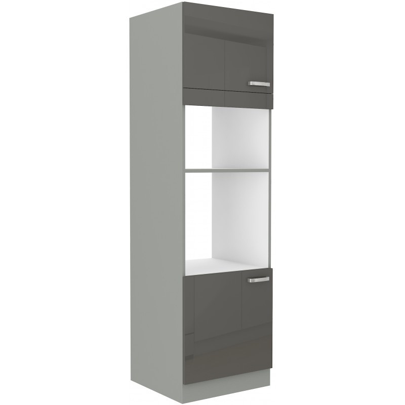 Vysoká kuchyňská skříň je určena pro vestavěnou mikrovlnou troubu a vestavěnou troubu. Vrchní skříňka nad skříní a spodní skříňka pod mají zabudovanou jednu polici. Skříň je vyrobena z lamina tloušťky 16 mm šedé lesklé barvy a bude dalším krásným kouskem ve Vaší kuchyňské sérii. Korpus skříňky je v šedém provedení. Na dvířkách jsou kovové úchytky ( délka 135mm) a dveře jsou vybaveny systémem tichého zavírání. Skříňka je vyrobena z kvalitních MDF desek. Poskládejte si z naší bohaté nabídky skříněk moderní a designovou kuchyň podle Vašich představ. Skříňka je dodávaná v demontu. Součástí je montážní plánek včetně všech potřebných spojovacích materiálů.