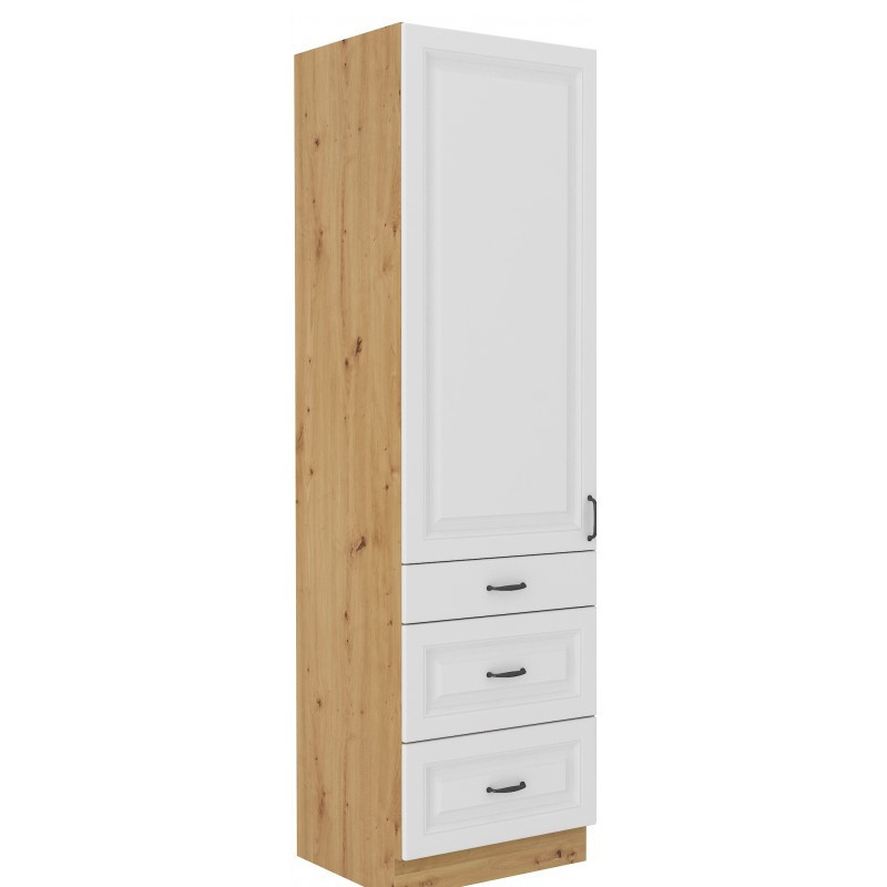 Velice praktická a dostatek místa poskytující vysoká kuchyňská skříň je vyrobena z lamina tloušťky 16 mm bílé barvy a je tak dalším krásným kouskem z této kuchyňské série. Korpus skříňky je v provedení dub artisan. Skříňka je rozdělená na dvě části. Horní část se skládá ze tří praktických polic. Spodní část skříně je tvořena šuplíky. Jeden nižší a dva vyšší šuplíky v šedé barvě pro praktické uskladnění všeho co v kuchyni potřebujete. Na dvířkách jsou černé kovové úchytky (délka 124mm) a jsou vybaveny systémem tichého zavírání. Skříňka je vyrobena z kvalitních MDF desek. Poskládejte si z naší bohaté nabídky skříněk moderní a designovou kuchyň podle Vašich představ. Skříňka je dodávaná v demontu. Součástí je montážní plánek včetně všech potřebných spojovacích materiálů.