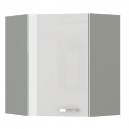 Tato elegantně zkosená horní kuchyňská skříňka dodá Vaší kuchyni jiskru a šmrnc. Je vyrobena z lamina tloušťky 16 mm bílé lesklé barvy. Korpus skříňky je v šedém provedení. Skvěle doplní další kuchyňský nábytek z této série a ve Vaší kuchyni nesmí chybět. Skříňka je vyrobena z kvalitních MDF desek a dvě vnitřní police Vám poskytnou dostatek úložného prostoru. Skříňka má kovový úchyt (délka 135mm) a dvířka jsou vybavena systémem tichého zavírání. Poskládejte si z naší bohaté nabídky skříněk moderní a designovou kuchyň podle Vašich představ. V doplňkových fotografiích najdete pro inspiraci fotky kuchyní, které jsou z těchto skříněk sestaveny. Skříňka je dodávaná v demontu. Součástí je montážní plánek včetně všech potřebných spojovacích materiálů.