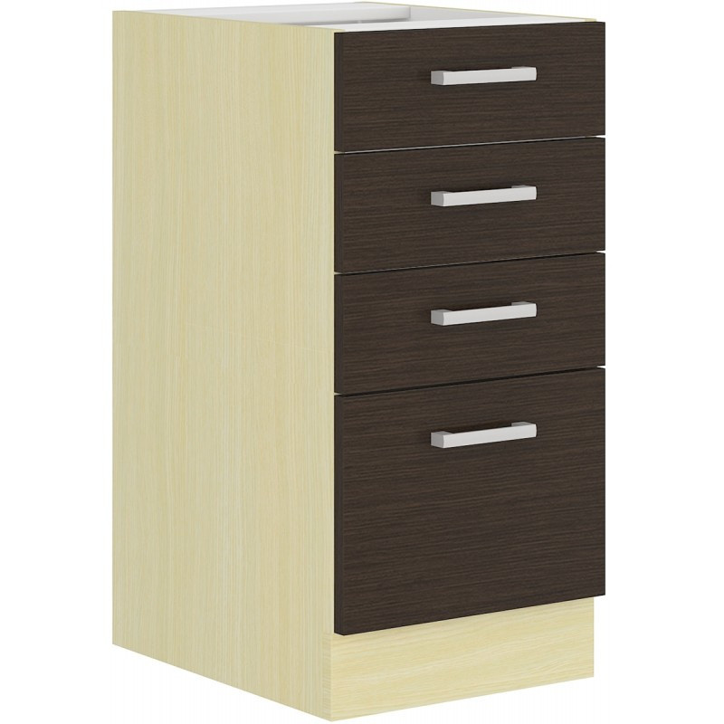 Kuchyňská skříňka Christo 40D4S se 4 zásuvkami je vyrobena z lamina tloušťky 16 mm v odstínu dub ferrara a legno tmavé. Úchytky jsou plastové a jsou v ceně. Vyberte si z naší nabídky skříněk a vytvořte si kuchyň dle vlastích představ. Může být rohová, rovná, krátká i dlouhá. Fantazii se meze nekladou. Skříňka je dodávaná v demontu bez pracovní desky. Součástí je montážní plánek včetně všech potřebných spojovacích materiálů.