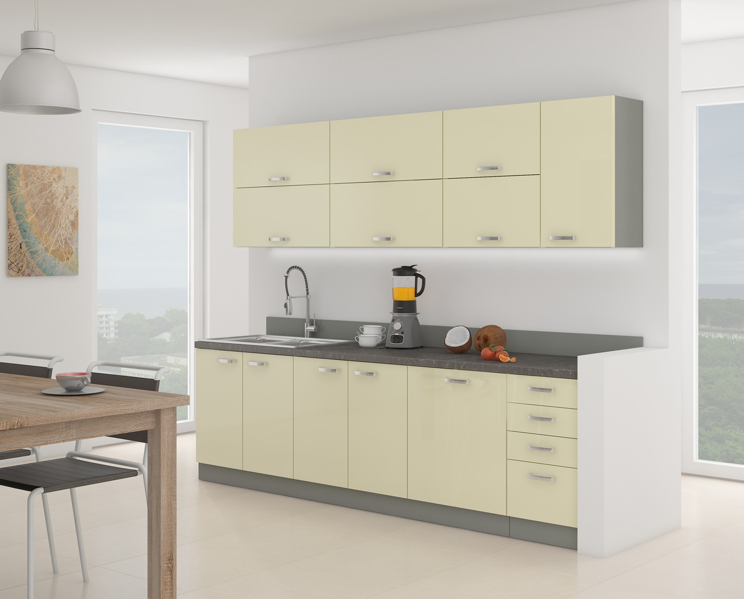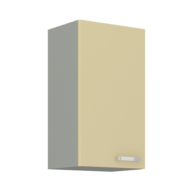 Horní kuchyňská skříňka je vyrobena z lamina tloušťky 16 mm lesklé krémové barvy. Korpus je v šedém provedení Dvířka mají lesklý kovový úchyt (délka 135 mm) a lze ho namontovat horizontálně či vertikálně. Dále jsou vybavena systémem tichého zavírání a při montáži si můžete zvolit pravé či levé otevírání dveří. Vnitřek skříňky je v bílé barvě a obsahuje celkem dvě police, které Vám poskytnou dostatek místa k uskladnění všeho, co budete v kuchyni potřebovat. V doplňujících fotografiích naleznete další možnosti k sestavení Vaší vysněné kuchyně. Nechte se inspirovat a poskládejte si z naší bohaté nabídky skříněk moderní a designovou kuchyň podle Vašich představ. Skříňka je dodávaná v demontu. Součástí je montážní plánek včetně všech potřebných spojovacích materiálů.