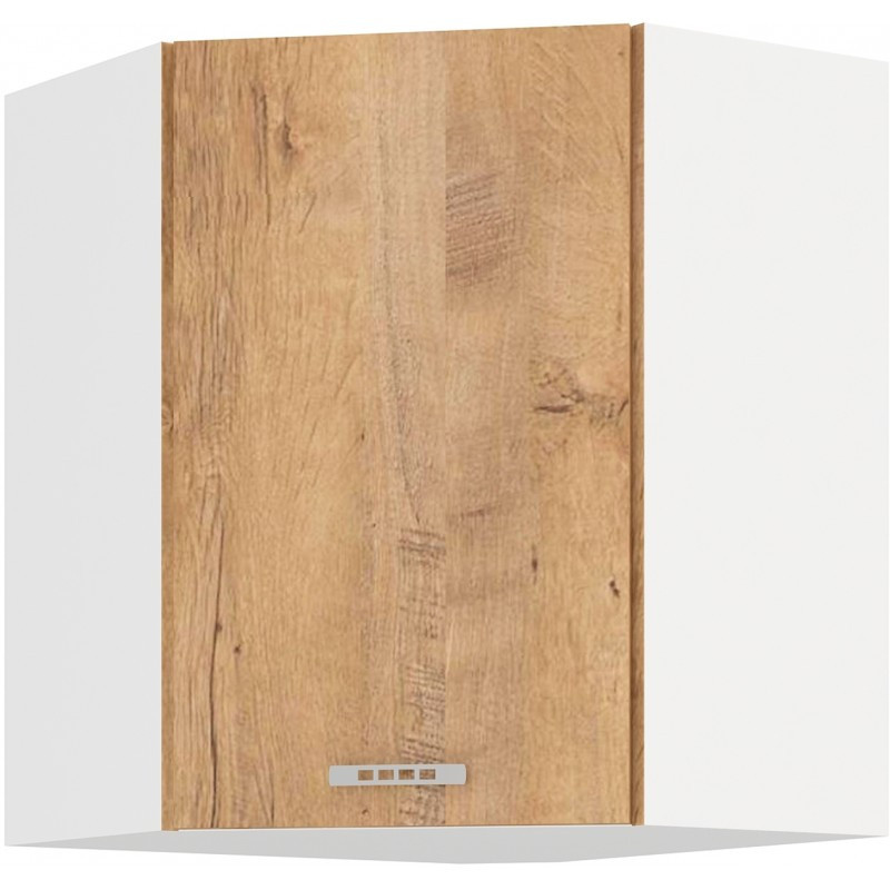Vrchní rohová kuchyňská skříňka Sally 58x58GN je vyrobena z lamina tloušťky 16 mm bílé barvy a s dvířky v odstínu dub lefkas. Vyberte si z naší nabídky skříněk a vytvořte si kuchyň dle vlastích představ. Může být rohová, rovná, krátká i dlouhá. Fantazii se meze nekladou. V doplňkových fotografiích najdete pro inspiraci fotky kuchyní, které jsou z těchto skříněk sestaveny. Skříňka je dodávaná v demontu. Součástí je montážní plánek včetně všech potřebných spojovacích materiálů.