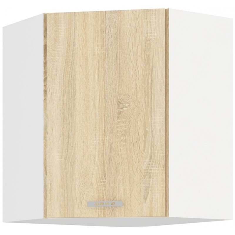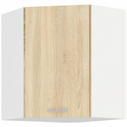 Vrchní rohová kuchyňská skříňka Sally 58x58GN je vyrobena z lamina tloušťky 16 mm bílé barvy a s dvířky v odstínu dub sonoma. Vyberte si z naší nabídky skříněk a vytvořte si kuchyň dle vlastích představ. Může být rohová, rovná, krátká i dlouhá. Fantazii se meze nekladou. V doplňkových fotografiích najdete pro inspiraci fotky kuchyní, které jsou z těchto skříněk sestaveny. Skříňka je dodávaná v demontu. Součástí je montážní plánek včetně všech potřebných spojovacích materiálů.