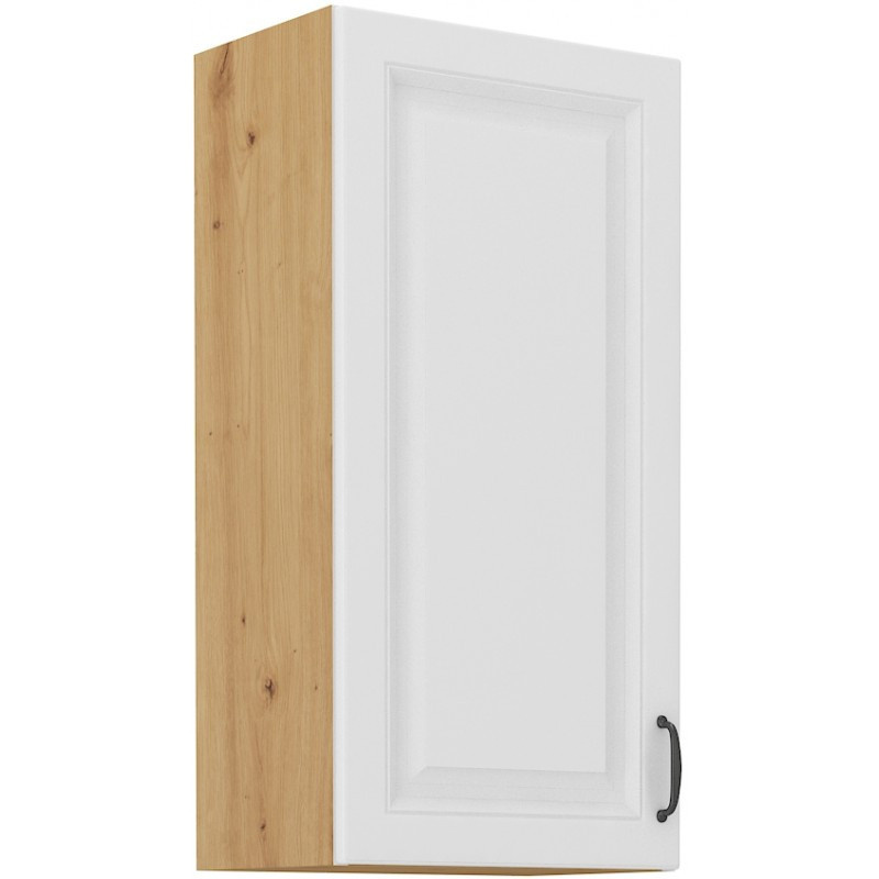 Horní kuchyňská skříňka je vyrobena z lamina tloušťky 16 mm bílé barvy. Korpus je v provedení dub artisan. Vnitřek skříňky má pak barvu bílou. Dvířka mají černý kovový úchyt (délka 124 mm). Jsou vybavena systémem tichého zavírání a při montáži si můžete zvolit pravé či levé otevírání dveří. Vnitřek skříňky obsahuje celkem dvě police, které Vám poskytnou dostatek místa k uskladnění všeho, co budete v kuchyni potřebovat. Poskládejte si z naší bohaté nabídky skříněk moderní a designovou kuchyň podle Vašich představ. Skříňka je dodávaná v demontu. Součástí je montážní plánek včetně všech potřebných spojovacích materiálů.