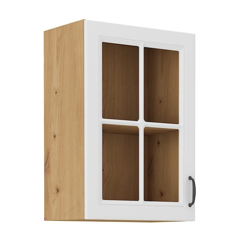 Tato krásná prosklená horní kuchyňská skříňka bude perfektním oživením Vaší kuchyně a dalším kouskem do série. Je vyrobena z lamina tloušťky 16 mm bílé barvy. Korpus je v provedení dub artisan. Dvířka mají černý kovový úchyt (délka 124 mm). Jsou vybavena systémem tichého zavírání a při montáži si můžete zvolit pravé či levé otevírání dveří. Vnitřek skříňky obsahuje celkem dvě police, které Vám poskytnou dostatek místa k uskladnění všeho, co budete v kuchyni potřebovat. Poskládejte si z naší bohaté nabídky skříněk moderní a designovou kuchyň podle Vašich představ. Skříňka je dodávaná v demontu. Součástí je montážní plánek včetně všech potřebných spojovacích materiálů.