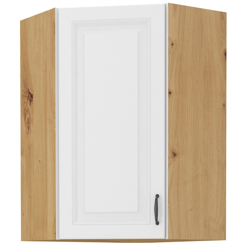 Tato elegantně zkosená horní kuchyňská skříňka dodá Vaší kuchyni jiskru a šmrnc. Je vyrobena z lamina tloušťky 16 mm v bílé barvě. Korpus je v provedení dub artisan a vnitřek má pak barvu bílou. Skvěle doplní další kuchyňský nábytek z této série a ve Vaší kuchyni nesmí chybět. Skříňka je vyrobena z kvalitních MDF desek a tři vnitřní police Vám poskytnou dostatek úložného prostoru. Skříňka má černý kovový úchyt (délka 124 mm) a dvířka jsou vybavena systémem tichého zavírání. Poskládejte si z naší bohaté nabídky skříněk moderní a designovou kuchyň podle Vašich představ. Skříňka je dodávaná v demontu. Součástí je montážní plánek včetně všech potřebných spojovacích materiálů.