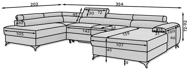 S šířkou 354 cm, výškou 92 cm a hloubkou 202 cm nabízí sedací souprava LACANTE dostatek prostoru pro celou rodinu i přátele. Její moderní design ve tvaru "U" je ideální pro velké obývací pokoje, kde se stane dominantním prvkem interiéru. Výška sedu 45 cm zajišťuje pohodlné sezení pro každého člena domácnosti.