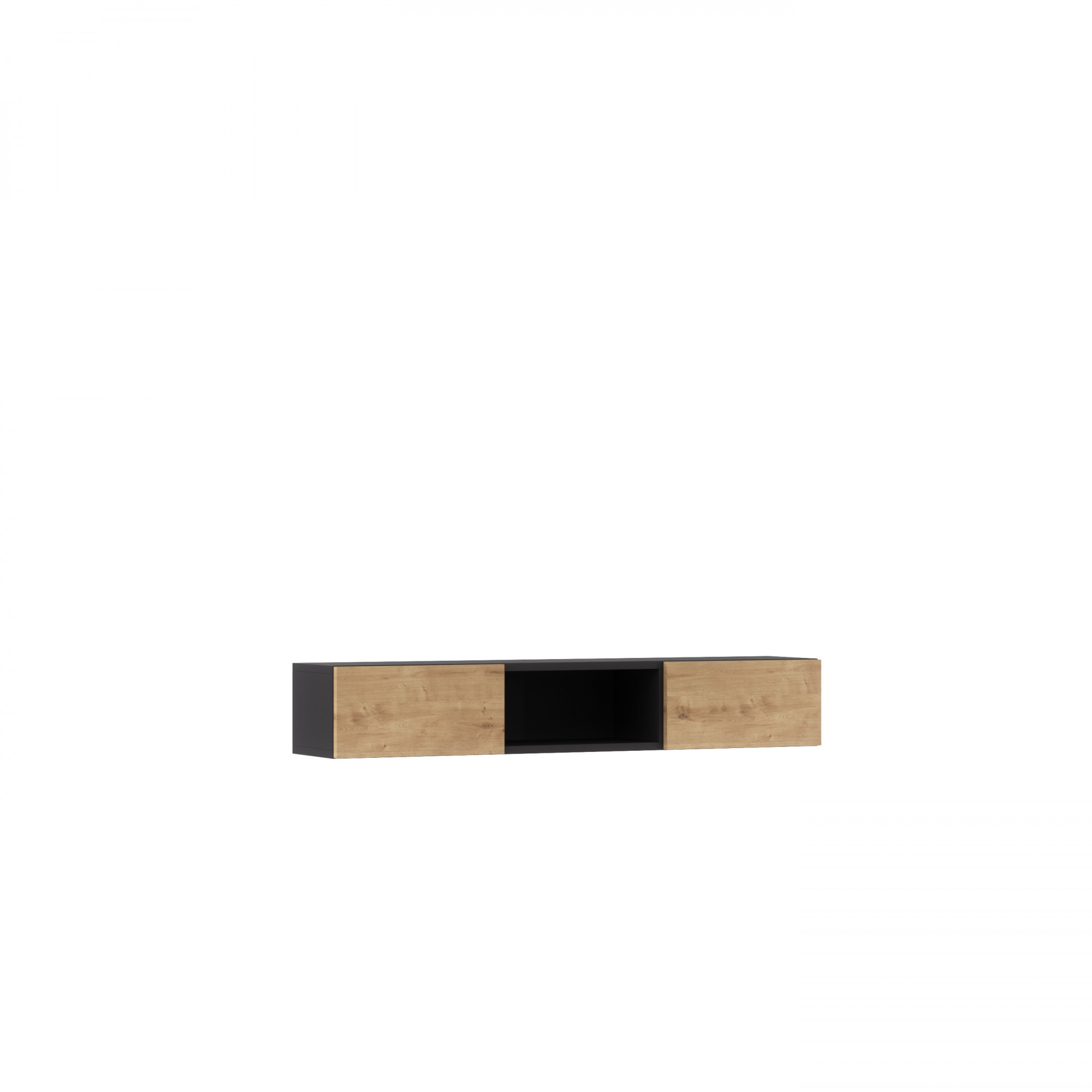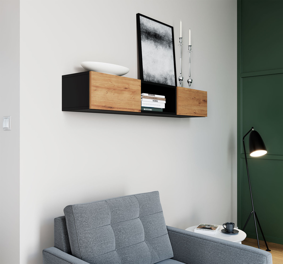 Závěsná police Lanzzi je jedinečný kus nábytku s výklenkem uprostřed a policí pro vystavení, stejně jako dvěma skříňkami s dvířky, které se otevírají stisknutím. Police bude skvěle sloužit k uložení několika trámů díky své šířce 120 cm a hloubce 25 cm. Praktické vložky skryjí drobnosti a pomáhají udržet jakoukoli místnost čistou a uklizenou. Rozpěrné hmoždinky potřebné k zavěšení police jsou součástí sady. Kus nábytku je vyroben z MDF a pokryt laminátem. Maximální zatížení nástěnné skříňky Lanzzi závisí na materiálu stěny, na kterou bude připevněna.Vyberte si ze dvou barevných verzí Snadná instalace Všechny komponenty jsou součástí výšky: 20 cm Hloubka: 25 cm Šířka: 120 cm Hmotnost: 11 kg Konfigurace plastu: černá matná + dub artisan / černá matná + černá matná Barva rámu: černá Materiál: MDF deska Počet dveří: 2 Počet polic: 4