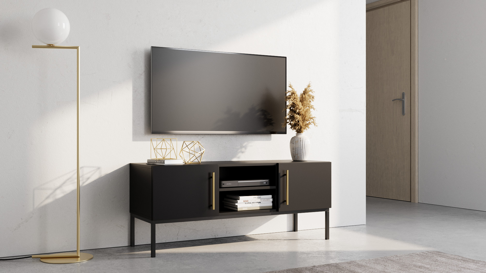 RTV skříňka z kolekce Lanzzi kombinuje moderní vzhled s praktickými funkcemi. Dvě skříňky usnadňují organizaci dálkových ovladačů, herních ovladačů a dalších TV doplňků. Matný černý dubový efekt skříňky Lanzzi RTV zachycuje krásu a strukturu přírodního dřeva. Možnost, kdy je nábytek pokrytý laminátem pouze v černé barvě, je lahůdkou pro milovníky minimalismu. Kovové, černé, 20centimetrové nohy zajišťují stabilitu skříně. Rozměry nábytku - 120 x 40 x 50 cm - vám umožňují umístit televizi a další dekorace. RTV skříňka z kolekce Lanzzi je částečně otevřený a částečně skrytý úložný prostor. Doporučujeme, aby byla RTV skříňka o něco širší než televize umístěná na ní.Výběr ze dvou barevných variant Nohy z práškově lakované oceli černé Bezúchytková varianta Výška: 50 cm Hloubka: 40 cm Hloubka: 120 cm Hmotnost: 24 kg Plastová konfigurace: černá matná+artisan dub / černá matná+černá matná Barva rámu: černá Materiál: MDF deska Design nohou: kov Počet dveří: 2 Počet otevřených polic: 2 Výška nohou: 20 cm