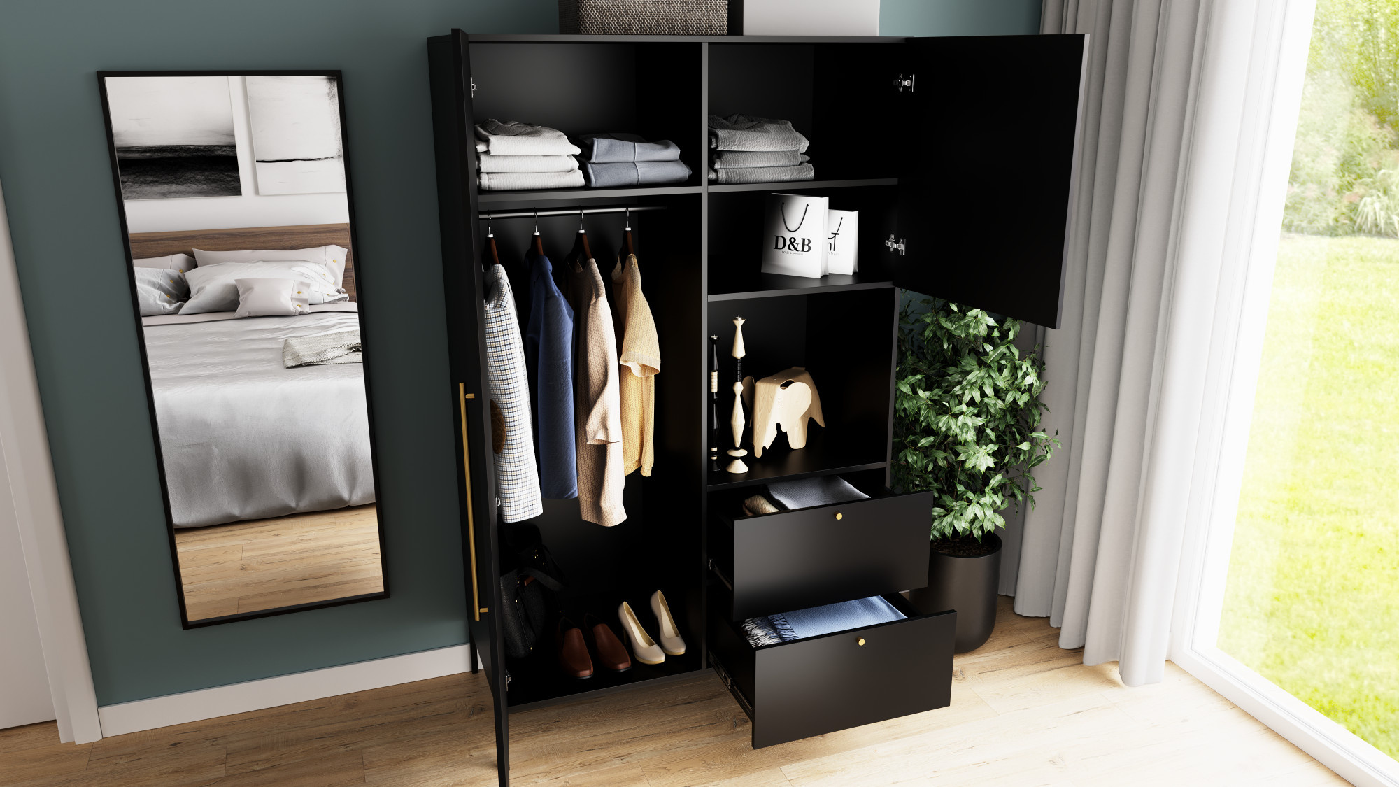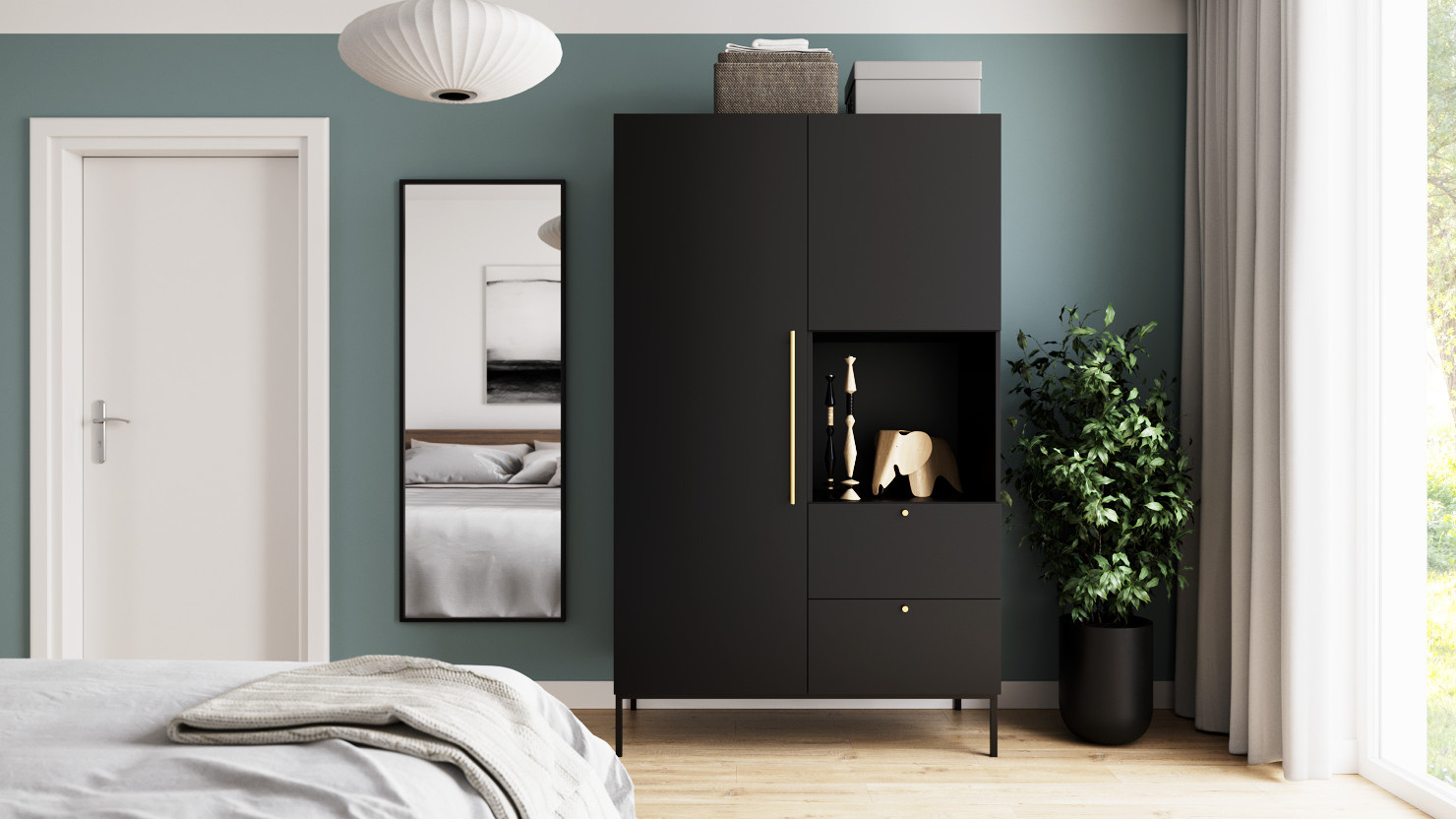 Skříň Lanzzi je skvělým doplňkem do každé šatny, chodby, obývacího pokoje nebo ložnice. Závěsná tyč, police a zásuvky činí tento kus nábytku použitelným na mnoha místech v domě. Skříň Lanzzi je k dispozici ve dvou barevných variantách: laminát v dekoru dubu artisan v kombinaci s matnou černou nebo matná černá. Tyto možnosti se také liší způsobem, jakým jsou některé prvky otevřeny. Skříň v černé barvě je navíc zdobena zlatými úchyty připevněnými k zásuvkám a velkým dveřím. Horní police se naopak otevírají pomocí funkce „push to open“. Skříň Lanzzi má kovový rám a MDF, a její rozměry: 120 x 60 x 200 cm - umožňují nábytku zapadnout do mnoha různých místností. Dostupné ve dvou barevných variantách Nohy z práškově lakované oceli černé Skříň zahrnuje úchyty a šatní tyč Výška: 200 cm Hloubka: 60 cm Šířka: 120 cm Hmotnost: 115 kg Barva rámu: černá Konfigurace plastu: černý mat + dub artisan / černý mat + černý mat Materiál: MDF deska Design nohou: kov Výška nohou: 20 cm Počet dveří: 2 Počet polic: 4 Počet zásuvek: 2 Počet otevřených polic: 1 Šatní tyč: 2