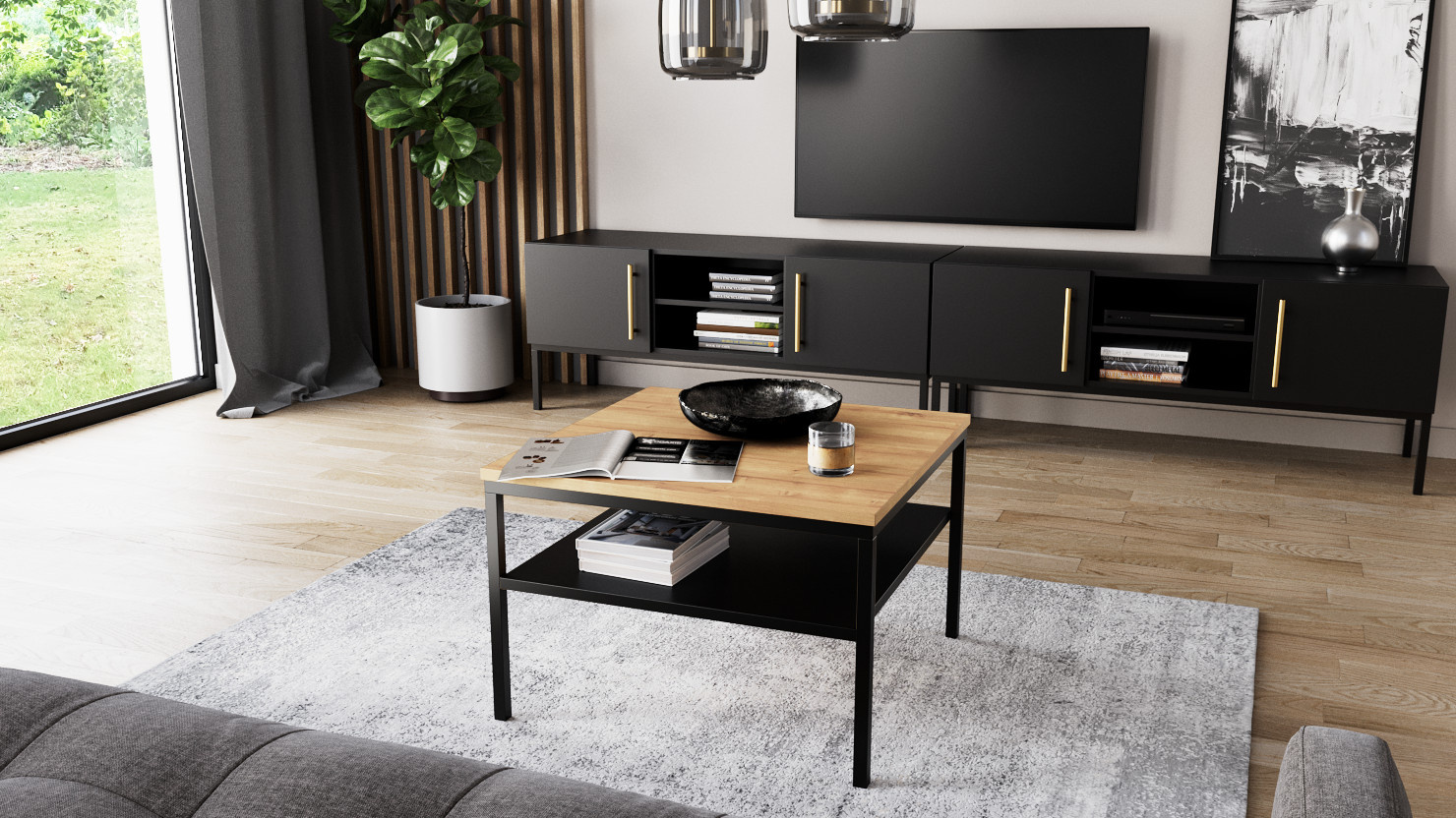 Stůl Lanzzi vytvoří dokonalou sestavu v kombinaci s vaším oblíbeným křeslem, pohovkou nebo rohovou sedačkou. Světlý, přirozený kontrast dubu s matnou černou nebo jen matná černá se dokonale kombinuje s černými nohami stolu. Vyrobený z kovu, rám má elegantní a stylový povrch. Čtvercové horní a dolní úrovně konferenčního stolku Lanzzi jsou vyrobeny z MDF potaženého laminátem, což poskytuje snadno čistitelný povrch, na který lze položit občerstvení nebo nápoje. Spodní police je ideální pro schování časopisů, ovladačů nebo křížovek. Konferenční stolek Lanzzi váží pouze 11.5 kilogramů, což usnadňuje přemístění a přemístění. Snadno srozumitelné pokyny vám umožní rychle a jednoduše sestavit náš stůl, abyste jej mohli co nejdříve používat a užívat si ho.Kovové nohy 40 cm dlouhé Práškově lakované nohy Dvě úrovně nábytku Výška: 40 cm Hloubka: 60 cm Šířka: 60 cm Hmotnost: 11.5 kg Plastová konfigurace: černá matná + umělecký dub / černá matná + černá matná Barva rámu: černá Materiál: MDF deska Design nohou: kov.