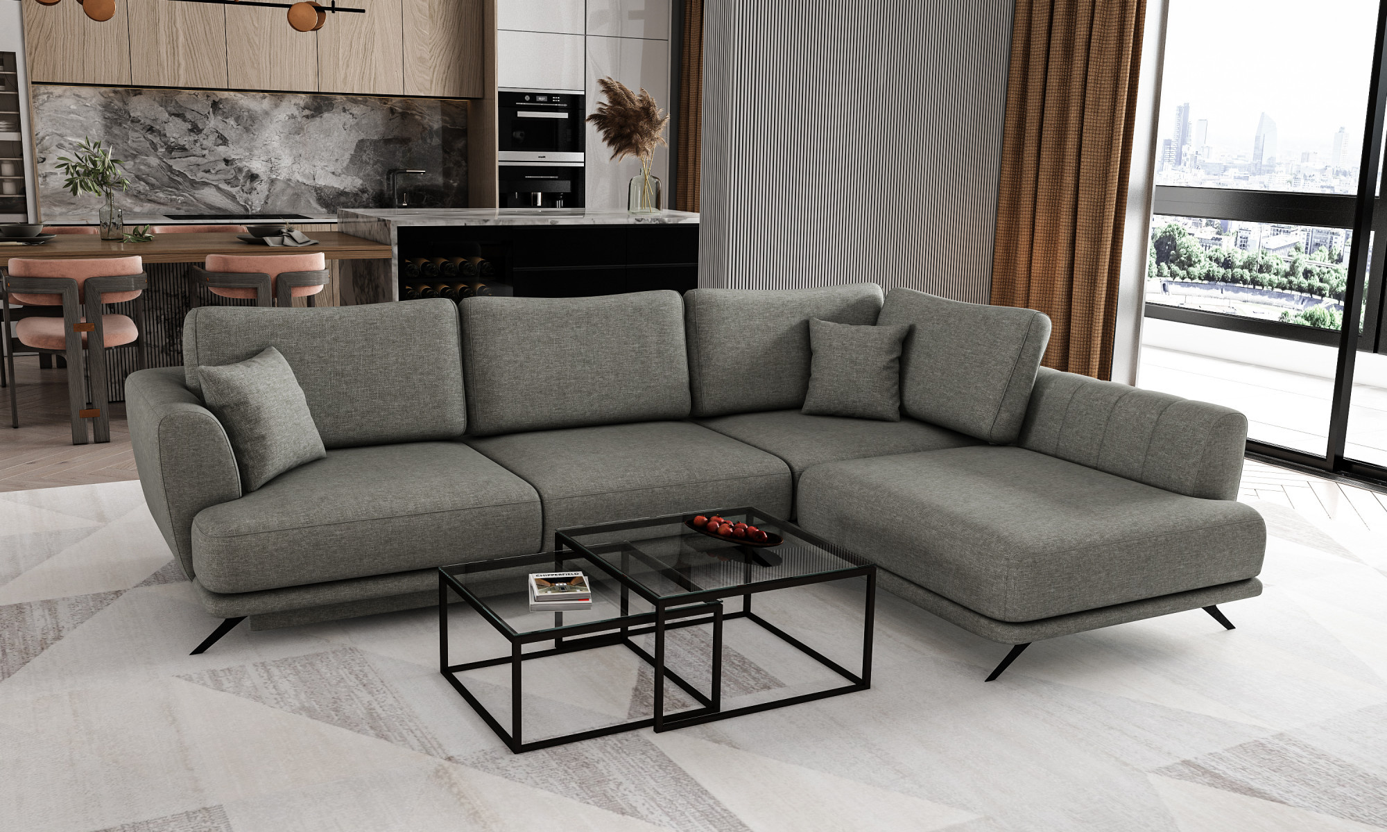 Larde je výjimečně útulná, přesto pohodlná a elegantní rohová pohovka ve tvaru L, měřící 276 x 191 x 90 cm. Jeho charakteristické rysy zahrnují: stabilní konstrukci, tlumený, ale zajímavý design, čalouněné opěradlo, velké polštáře, stylové nohy, které dodávají celé struktuře lehkost, a hluboké, měkké sedadlo vyrobené z HR pěny. Zaručují také správnou polohu těla při odpočinku a značné pohodlí. Rohová pohovka Larde je multifunkční kus nábytku, protože poskytuje maximální úroveň pohodlí jak během dne, tak v noci. Po rozložení pohovky pomocí intuitivního a jednoduchého mechanismu DL získáme spací plochu o rozměrech 126 x 240 cm a prostorný úložný prostor na ložní prádlo. Larde je kus nábytku, který bude odpovědí na všechny vaše požadavky. Má vše, co potřebujete k dosažení odpočinku na nejvyšší úrovni. Zveme vás, abyste se podívali na naši nabídku.