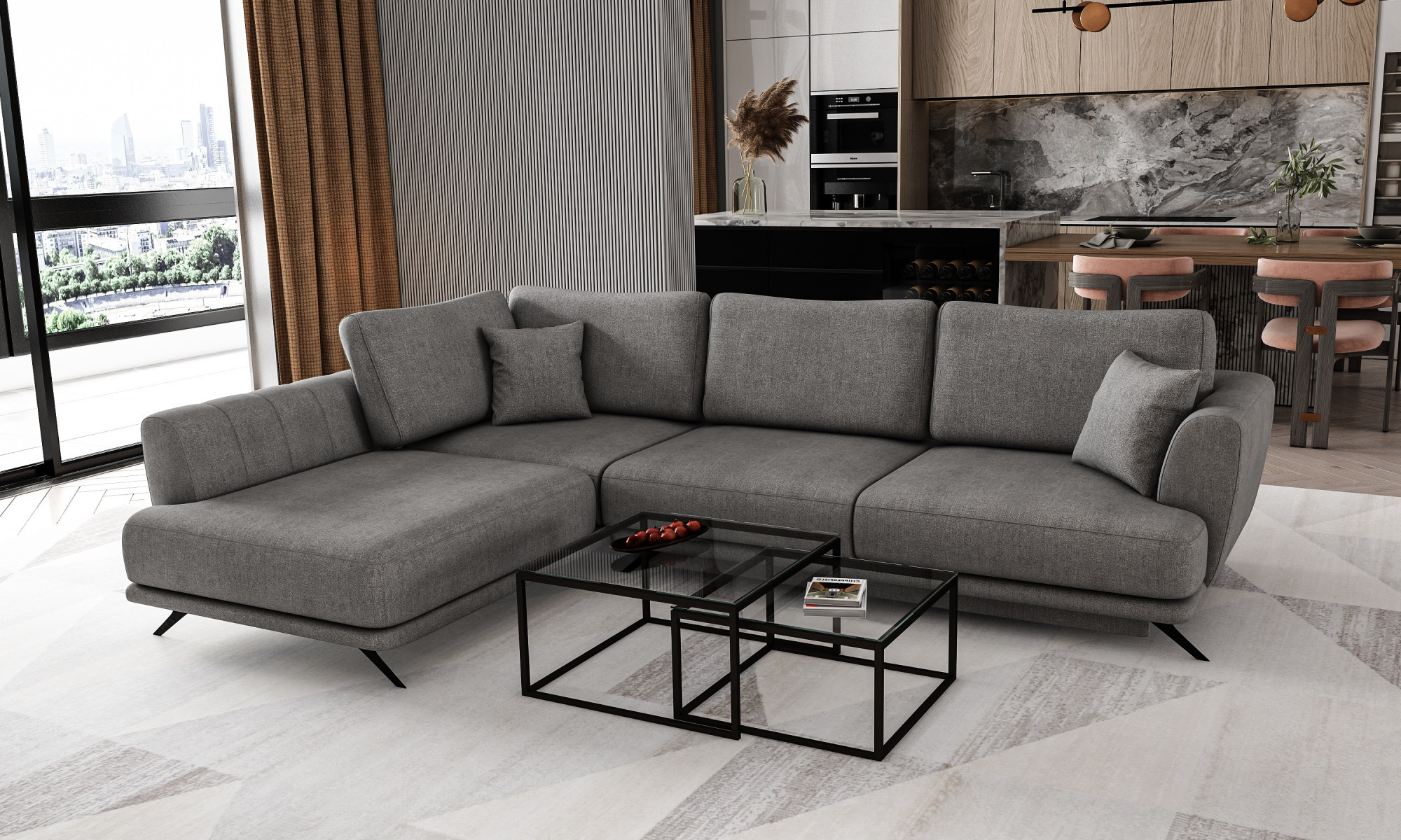 Larde je výjimečně útulná, přesto pohodlná a elegantní rohová pohovka ve tvaru L, měřící 276 x 191 x 90 cm. Jeho charakteristické rysy zahrnují: stabilní konstrukci, tlumený, ale zajímavý design, čalouněné opěradlo, velké polštáře, stylové nohy, které dodávají celé struktuře lehkost, a hluboké, měkké sedadlo vyrobené z HR pěny. Zaručují také správnou polohu těla při odpočinku a značné pohodlí. Rohová pohovka Larde je multifunkční kus nábytku, protože poskytuje maximální úroveň pohodlí jak během dne, tak v noci. Po rozložení pohovky pomocí intuitivního a jednoduchého mechanismu DL získáme spací plochu o rozměrech 126 x 240 cm a prostorný úložný prostor na ložní prádlo. Larde je kus nábytku, který bude odpovědí na všechny vaše požadavky. Má vše, co potřebujete k dosažení odpočinku na nejvyšší úrovni. Zveme vás, abyste se podívali na naši nabídku.