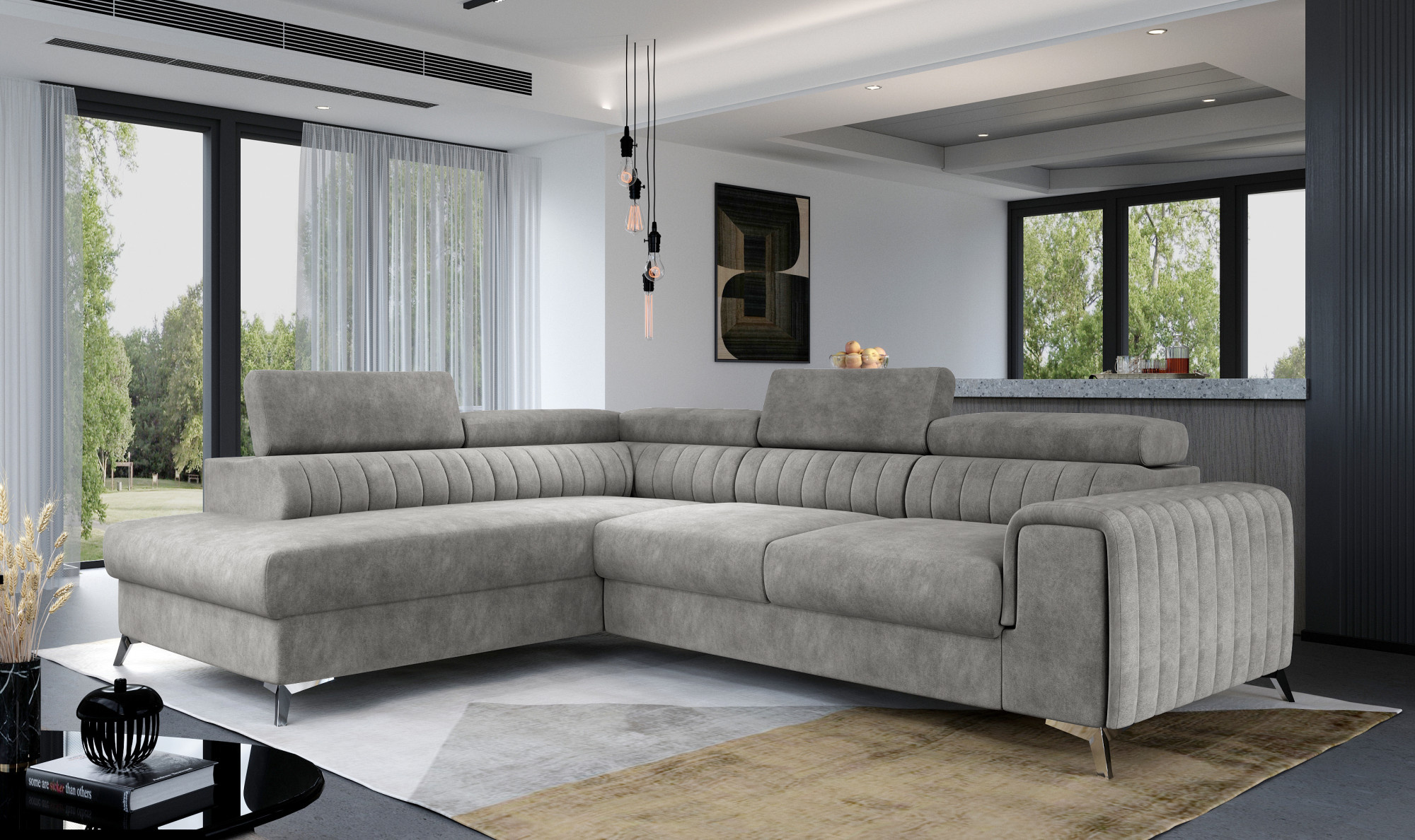Laurence je stylová, funkční a především elegantní rohová pohovka pro náročné znalce pohodlí. Vysoký komfort odpočinku je zvýšen nastavitelnými vysokými opěrkami hlavy a širokým sedadlem. Nábytek o rozměrech 278 x 205 x 92 cm je vyroben z vlnité pružiny typu B, pěny T30 a HR, což zajistí nejvyšší komfort při každodenním používání pohovky během dne, stejně jako postele po setmění, protože díky funkci typu delfín je rohová sedačka Laurence vhodná i pro noční odpočinek. Rohová pohovka ve tvaru L je vybavena funkcí spaní o rozměrech 123 x 193 cm. Kromě toho má také prostorný úložný prostor na lůžkoviny. S elegantním prošíváním a 9 cm ocelovými nohami je rohová pohovka udržována v moderním stylu dokončení. Produkt je dostupný ve všech látkách z kolekce Eltap. Pokud hledáte závan čerstvého vzduchu a modernistický nádech - Laurence bude pro vás jistě perfektní.