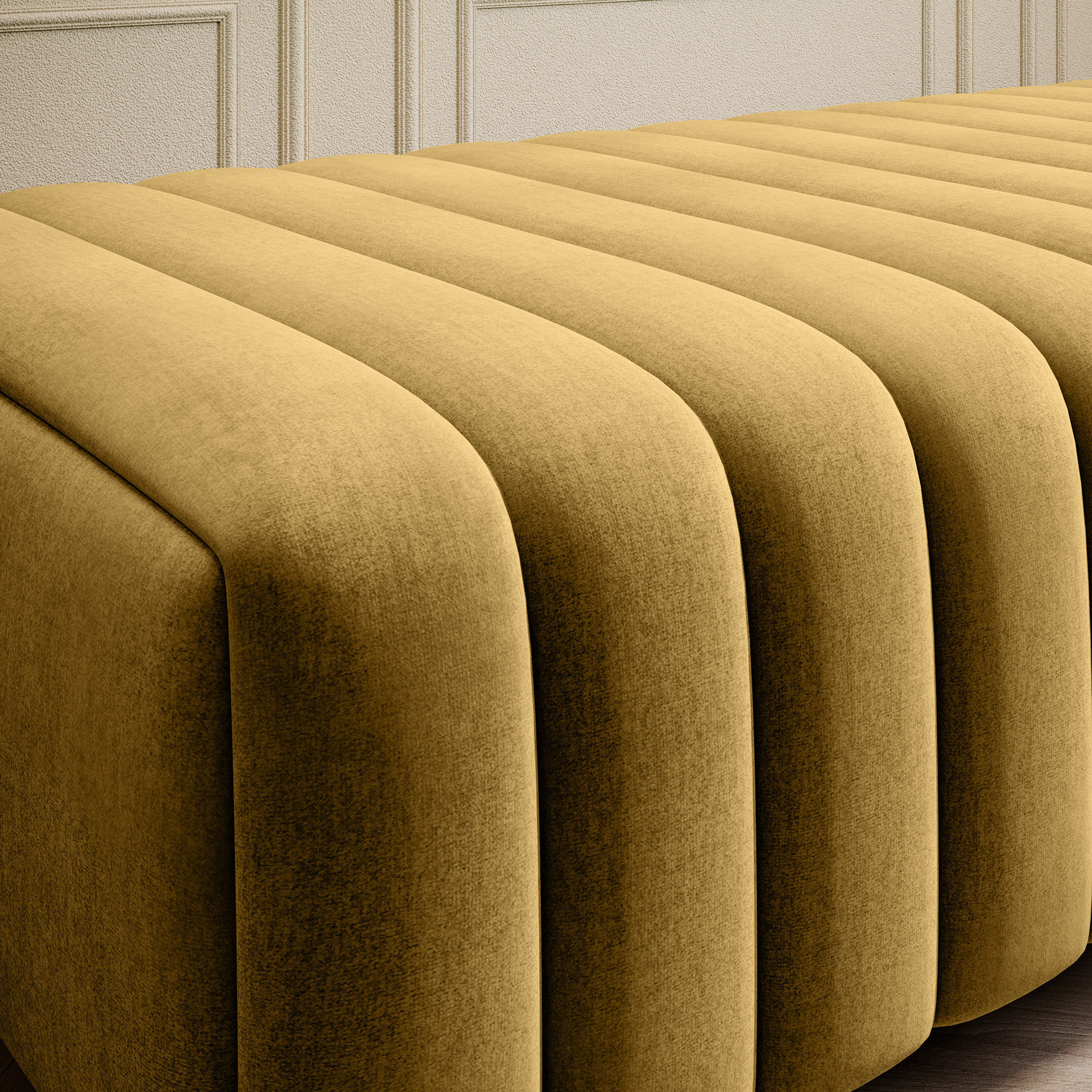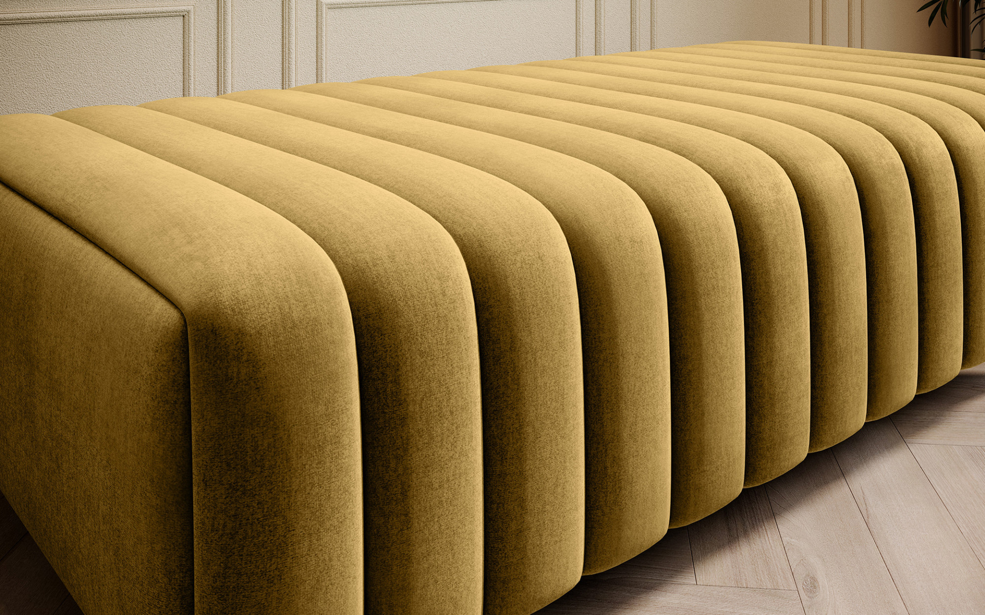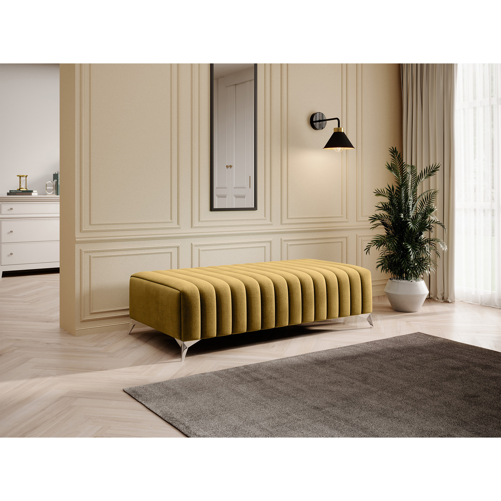 Jeho nízká výška sedu 36 cm je ideální pro pohodlné sezení, zatímco šířka 132 cm a hloubka 64 cm poskytují dostatek prostoru pro relaxaci. Taburet může sloužit jako místo pro odpočinek nohou, přídavné sezení pro hosty nebo dokonce jako stylový stolek pro odložení knihy či šálku kávy.