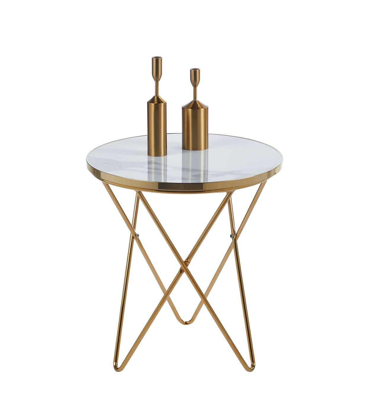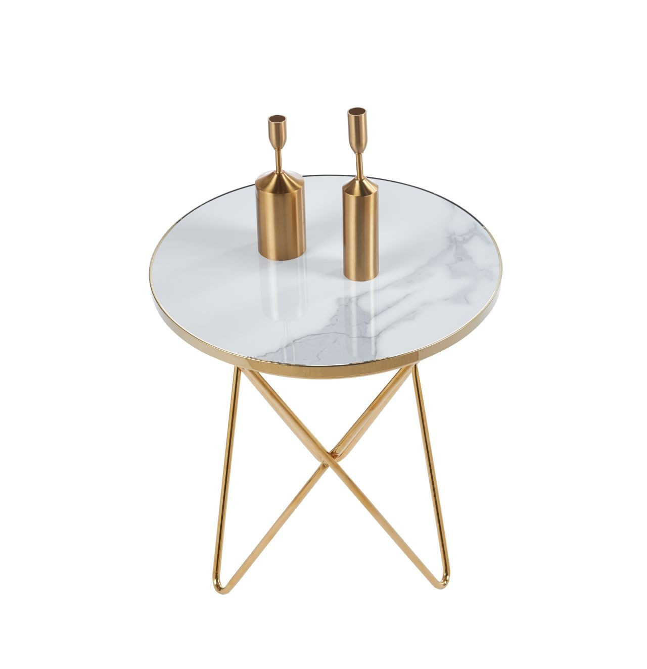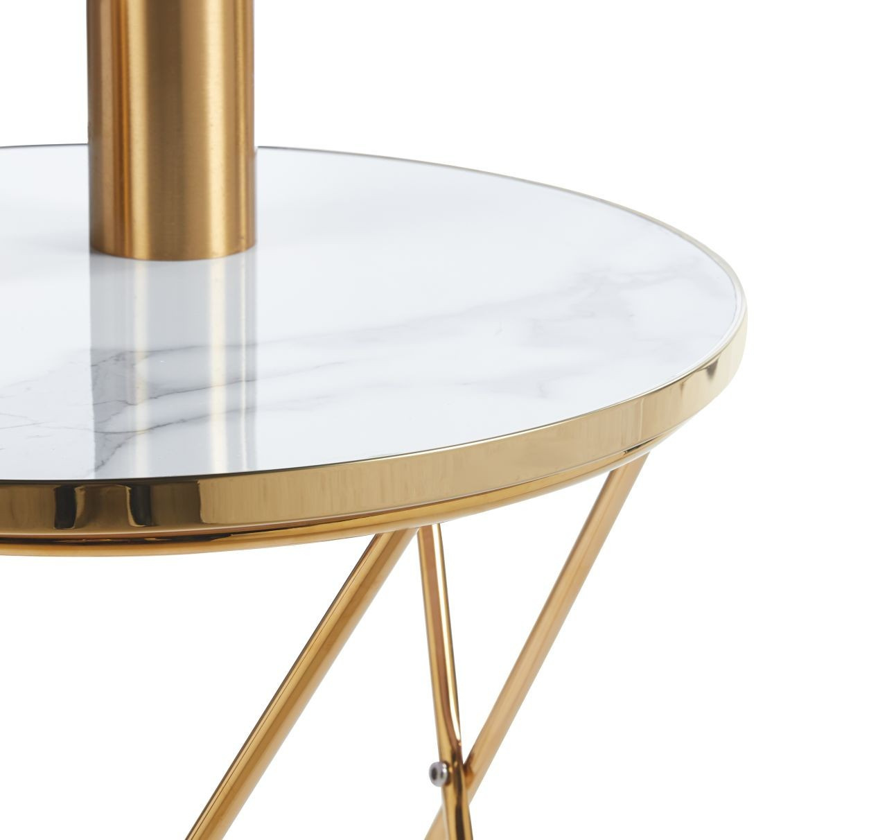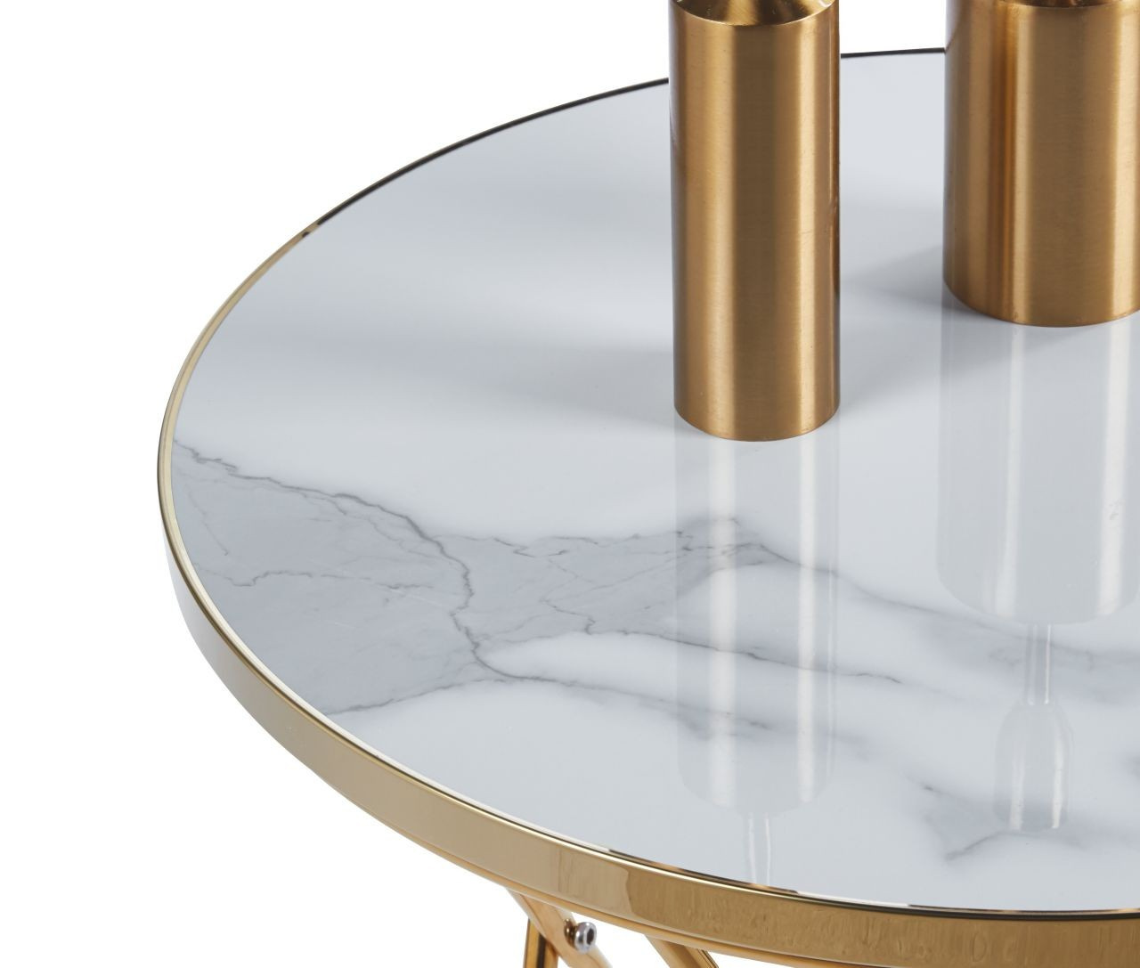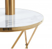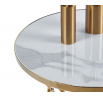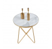 Rozměry: - deska: průměr 50 cm - výška: 55 cm Materiál: - deska: sklo - základna: chromovaný kov Barva: - deska: bílý mramor - základna: zlatá