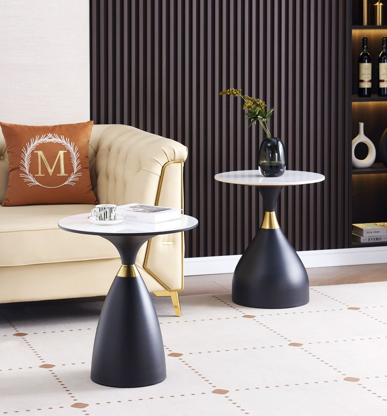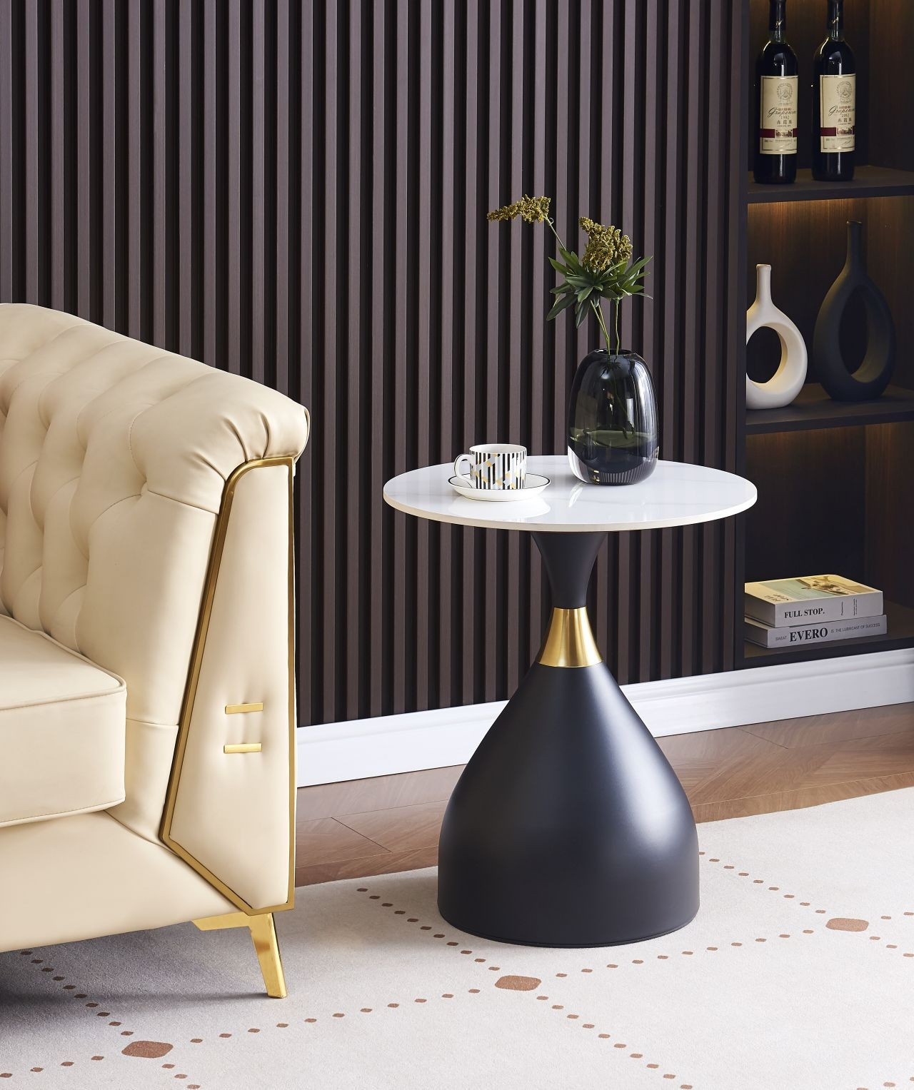Rozměry: - průměr desky: 50 cm - výška: 57 cm - podrobné rozměry na poslední fotografii Materiál: - deska: keramika - základna: kov s práškovým nástřikem Barva: - deska: bílý mramor - základna: černá + zlatá dekorace