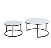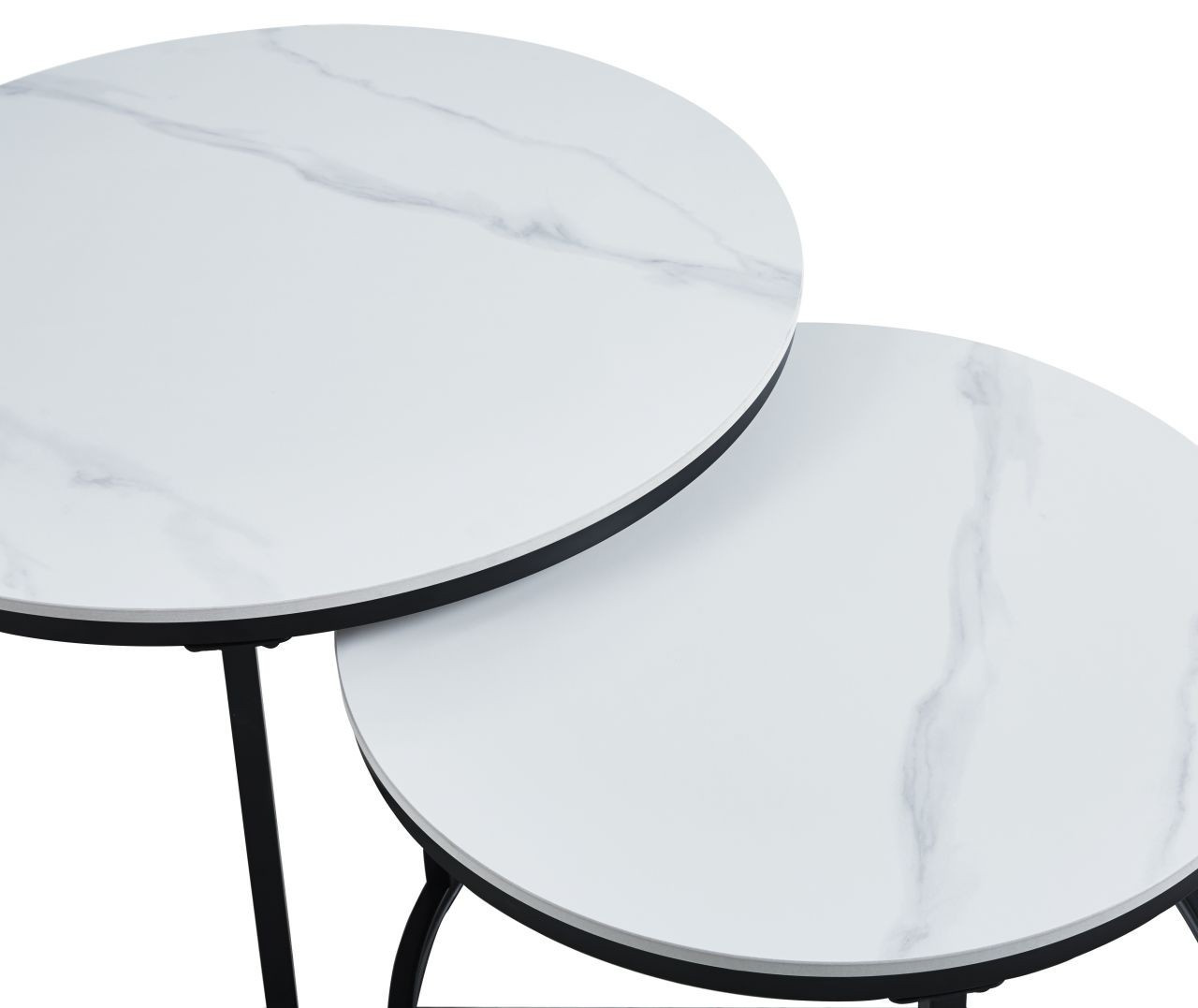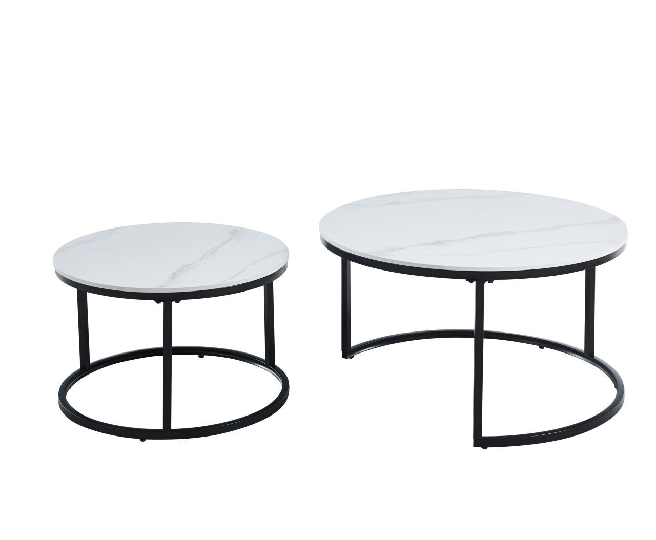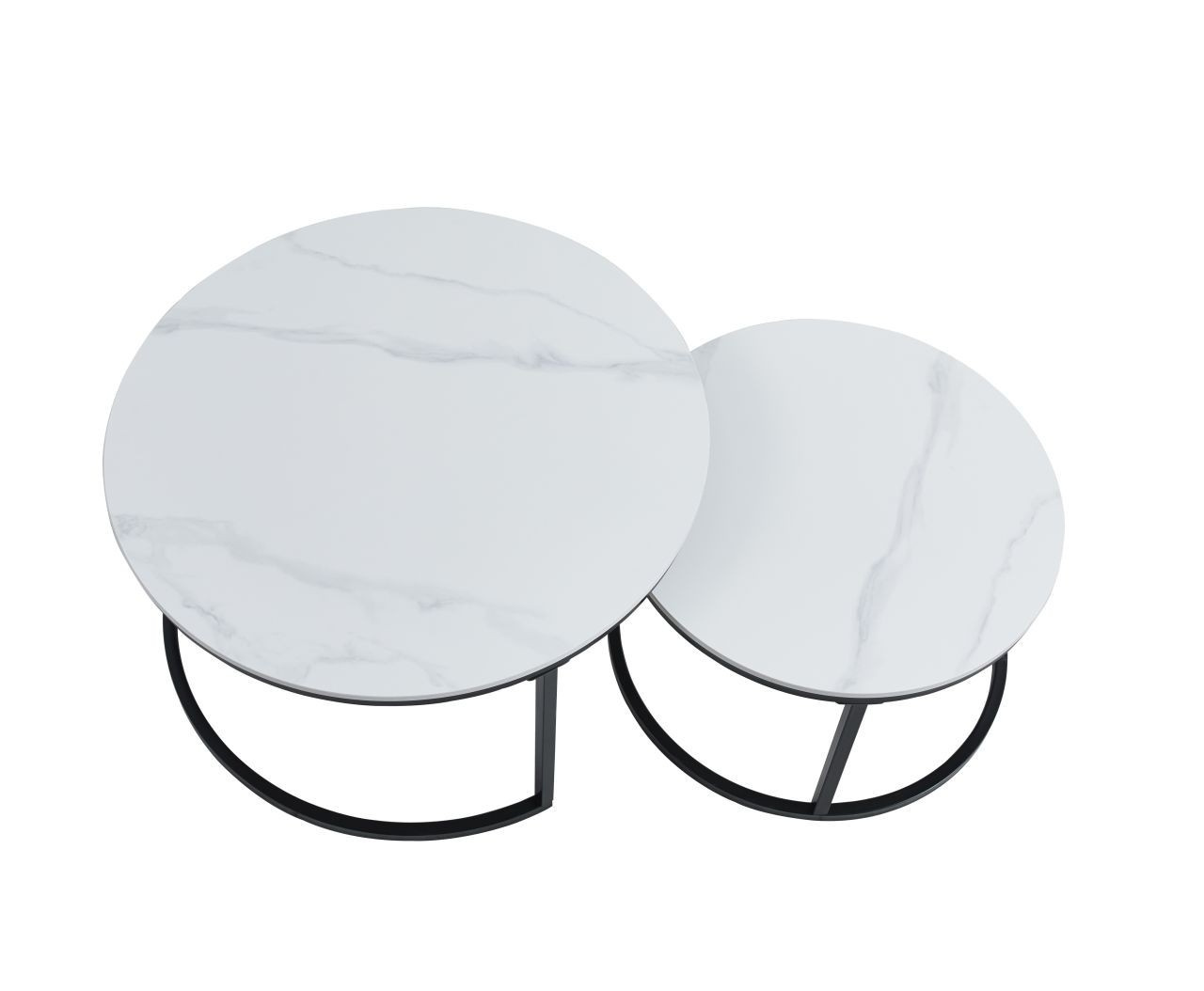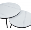 Rozměry: *větší stolek: - deska: průměr 80 cm - výška: 44 cm *menší stolek: - deska: průměr 60 cm - výška: 38 cm Materiál: - deska: keramika (mat) - nohy: kov lakovaný práškovou barvou Barva: - desky: bílý mramor - konstrukce: černá