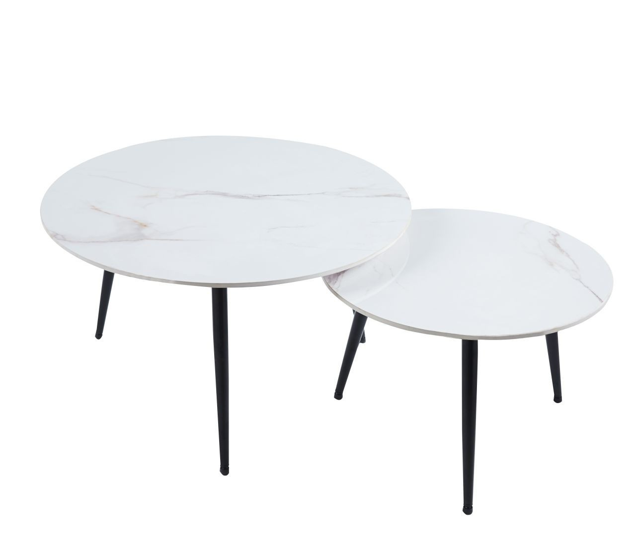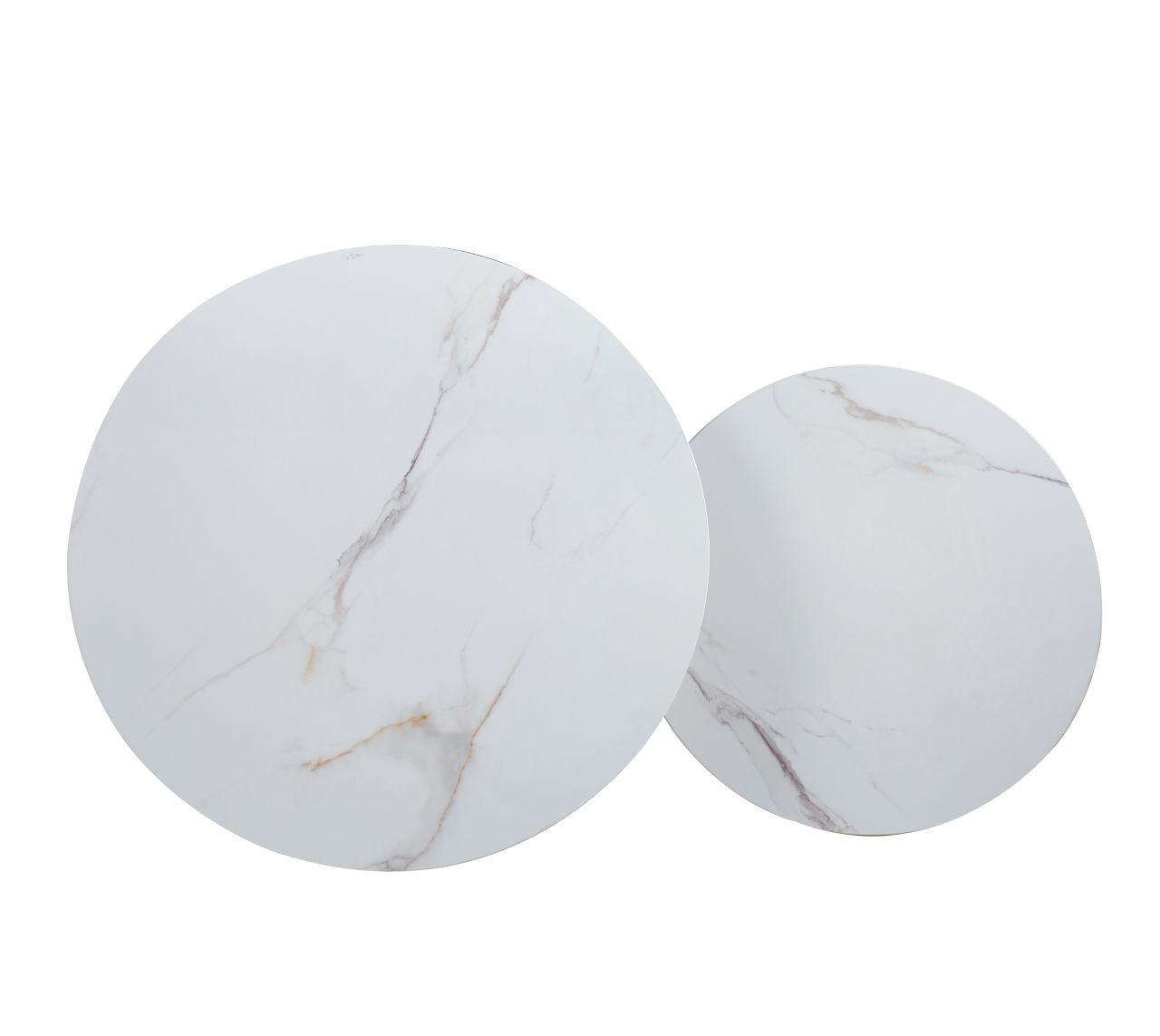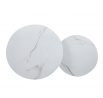 Rozměry: *větší stolek: - deska: průměr 80 cm - výška: 45 cm *menší stolek: - deska: průměr 60 cm - výška: 40 cm Materiál: - deska: keramika (lesk) - nohy: kov lakovaný práškovou barvou Barva: - desky: bílý mramor - konstrukce: černá