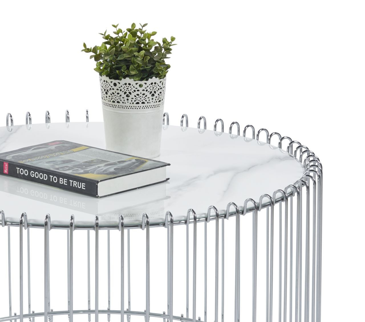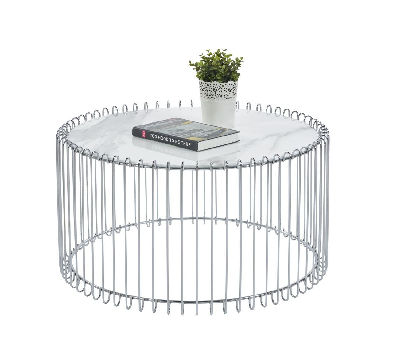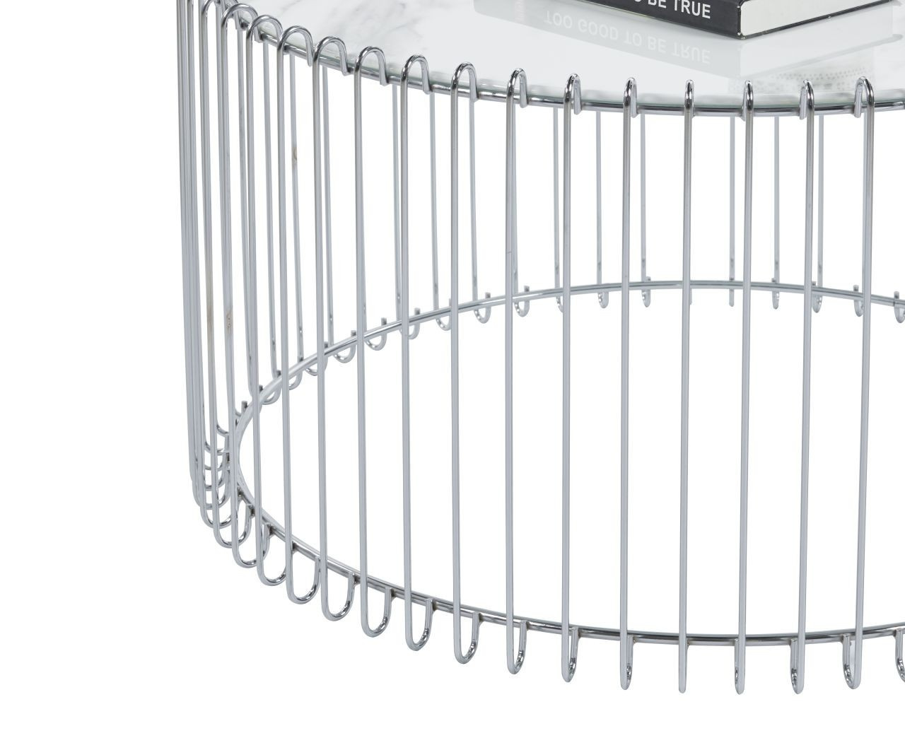Rozměry: - deska: průměr 80 cm - výška: 42 cm Materiál: - deska: sklo - základna: chrom Barva: - deska: bílý mramor - základna: stříbrná
