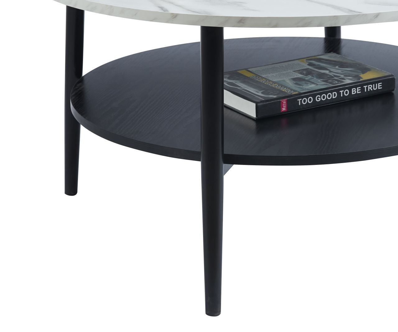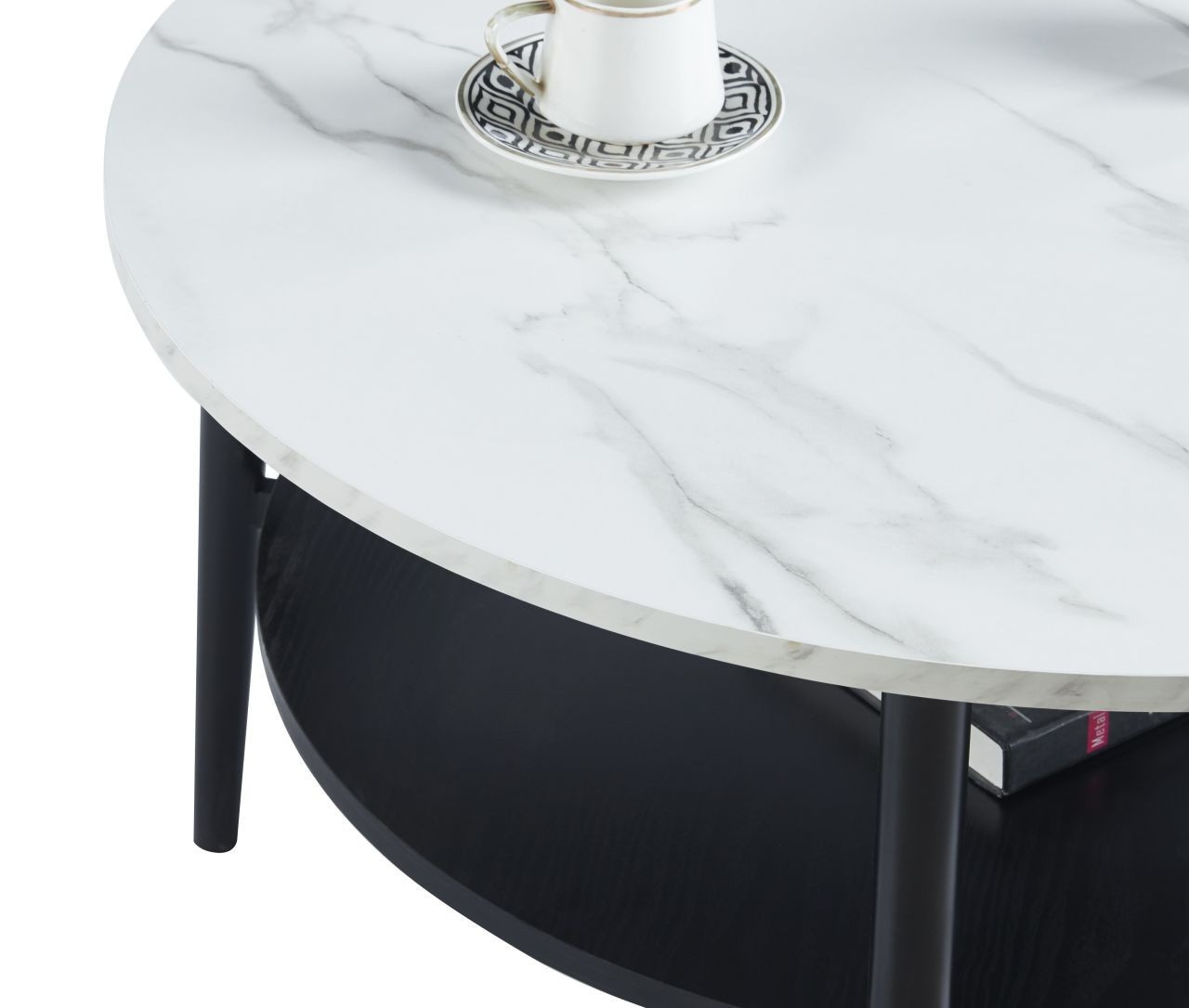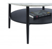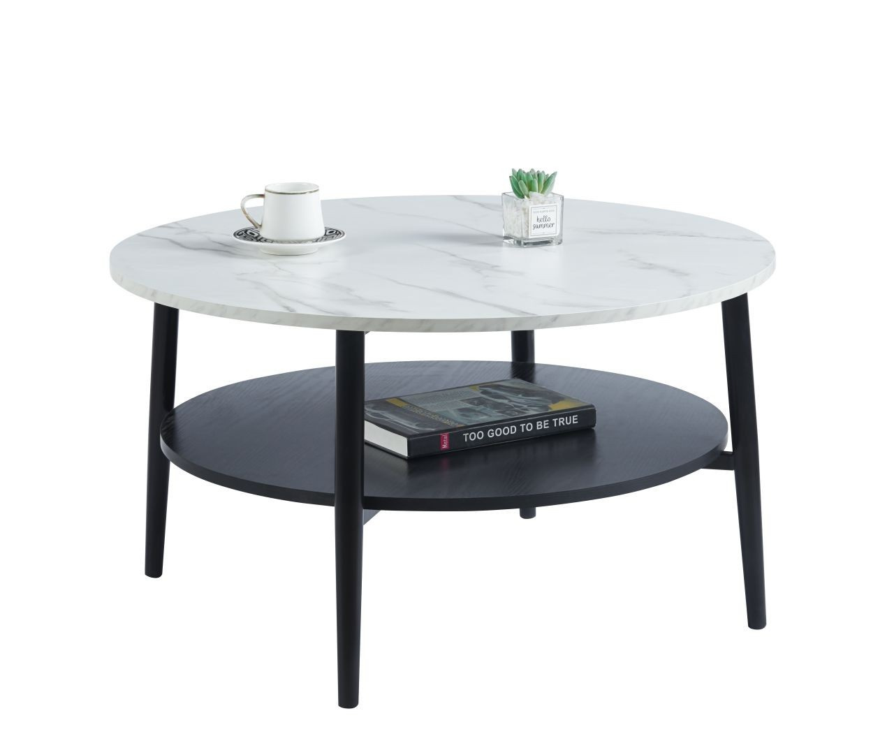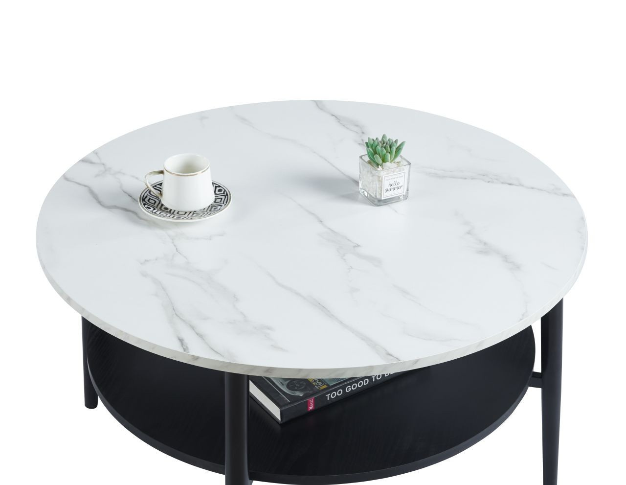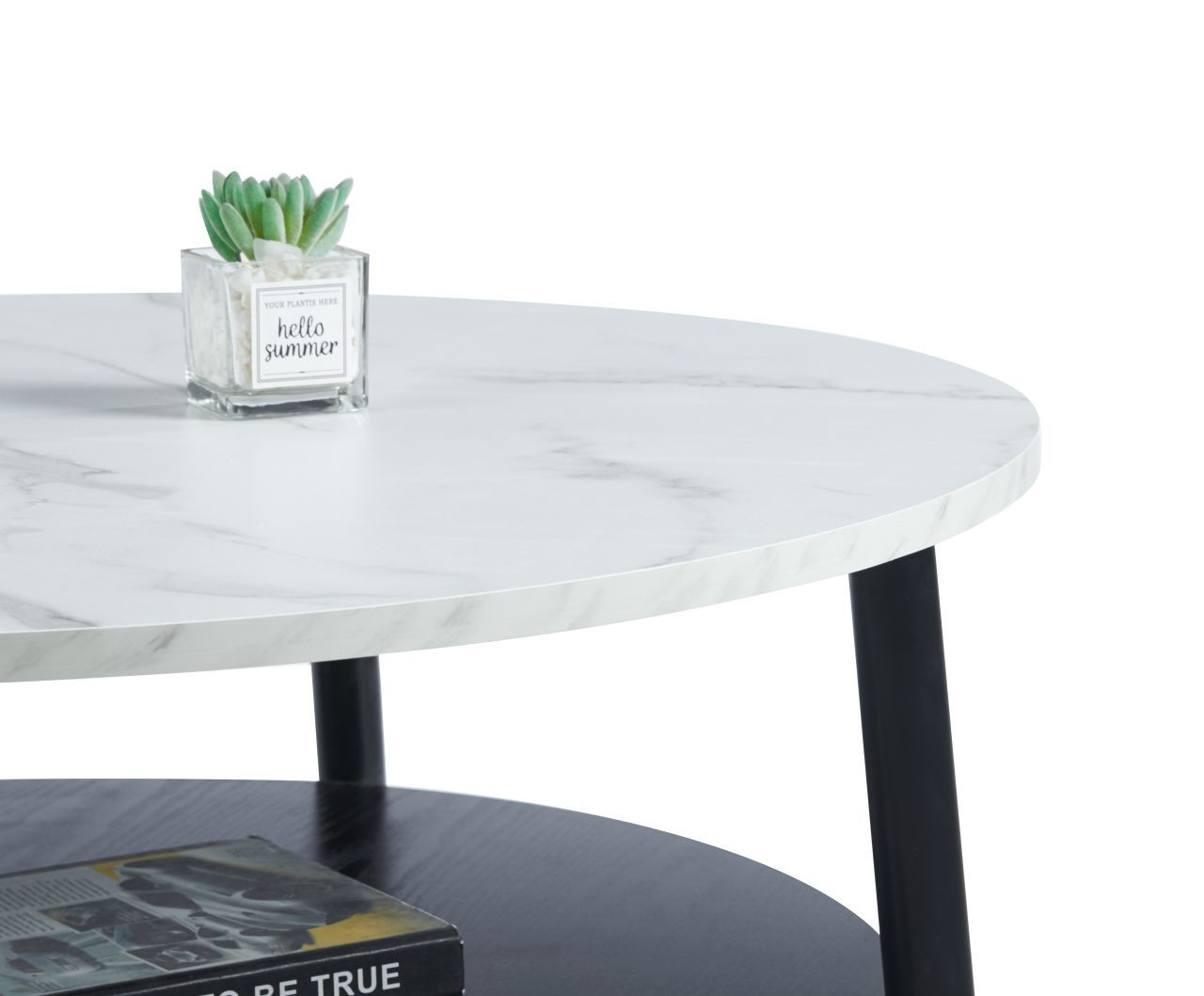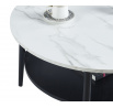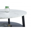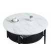 Rozměry: - průměr 80 cm - výška: 45 cm Materiál: - desky: laminovaná dřevotříska - základna: kov lakovaný práškovou barvou Barva: - horní deska: bílý mramor - spodní deska: černá - základna: černá