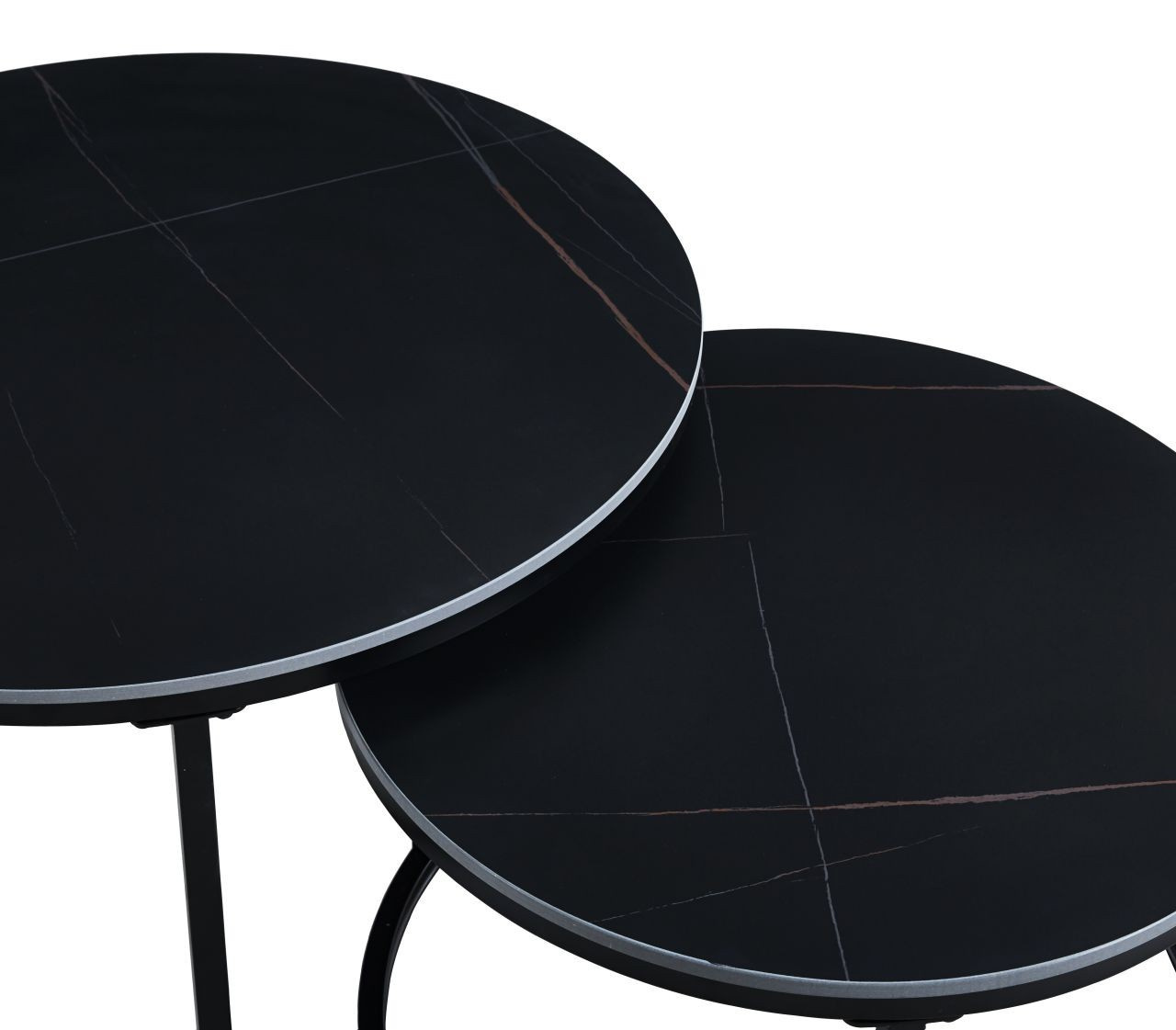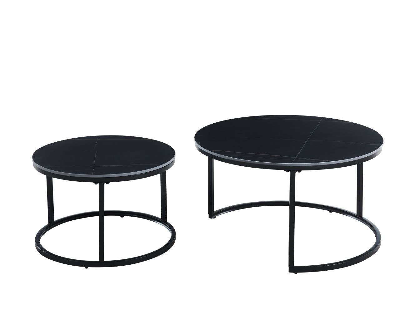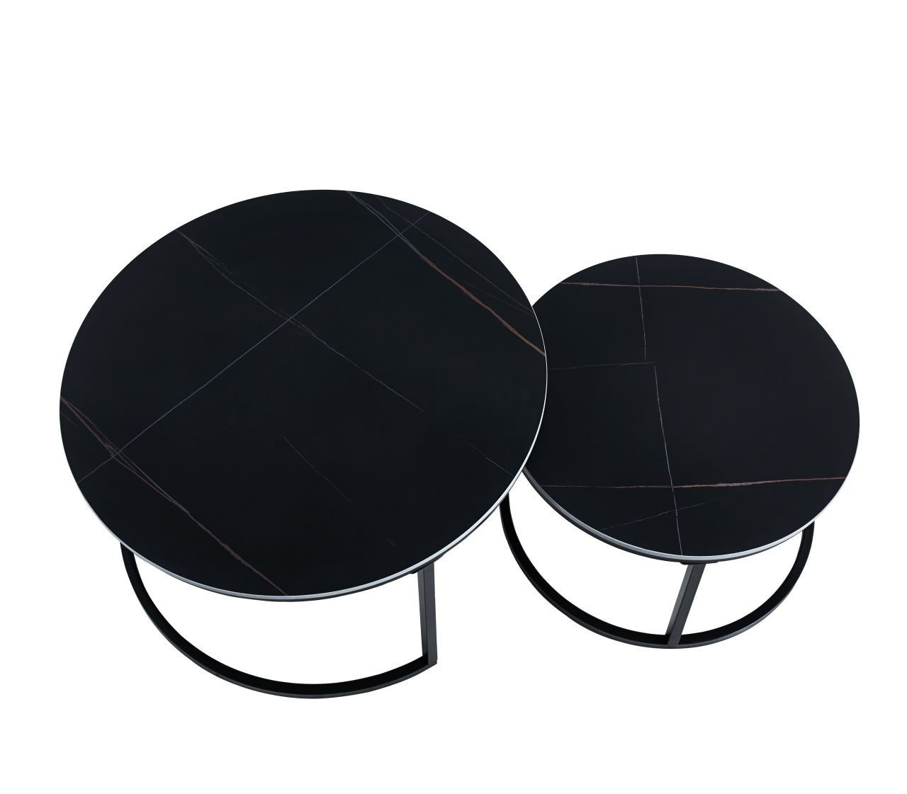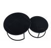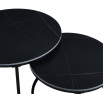 Rozměry: *větší stolek: - deska: průměr 80 cm - výška: 44 cm *menší stolek: - deska: průměr 60 cm - výška: 38 cm Materiál: - deska: keramika (mat) - nohy: kov lakovaný práškovou barvou Barva: - desky: černé - konstrukce: černá