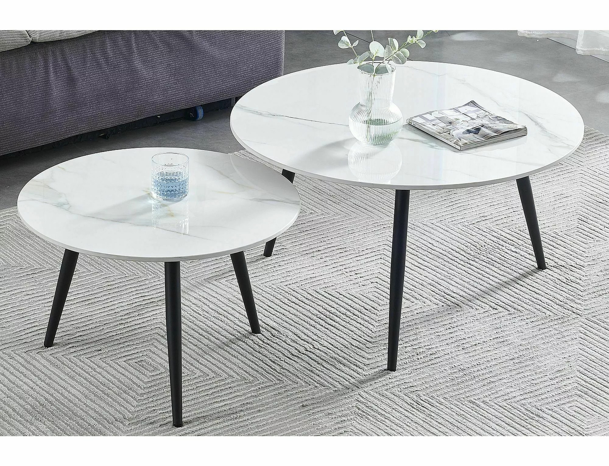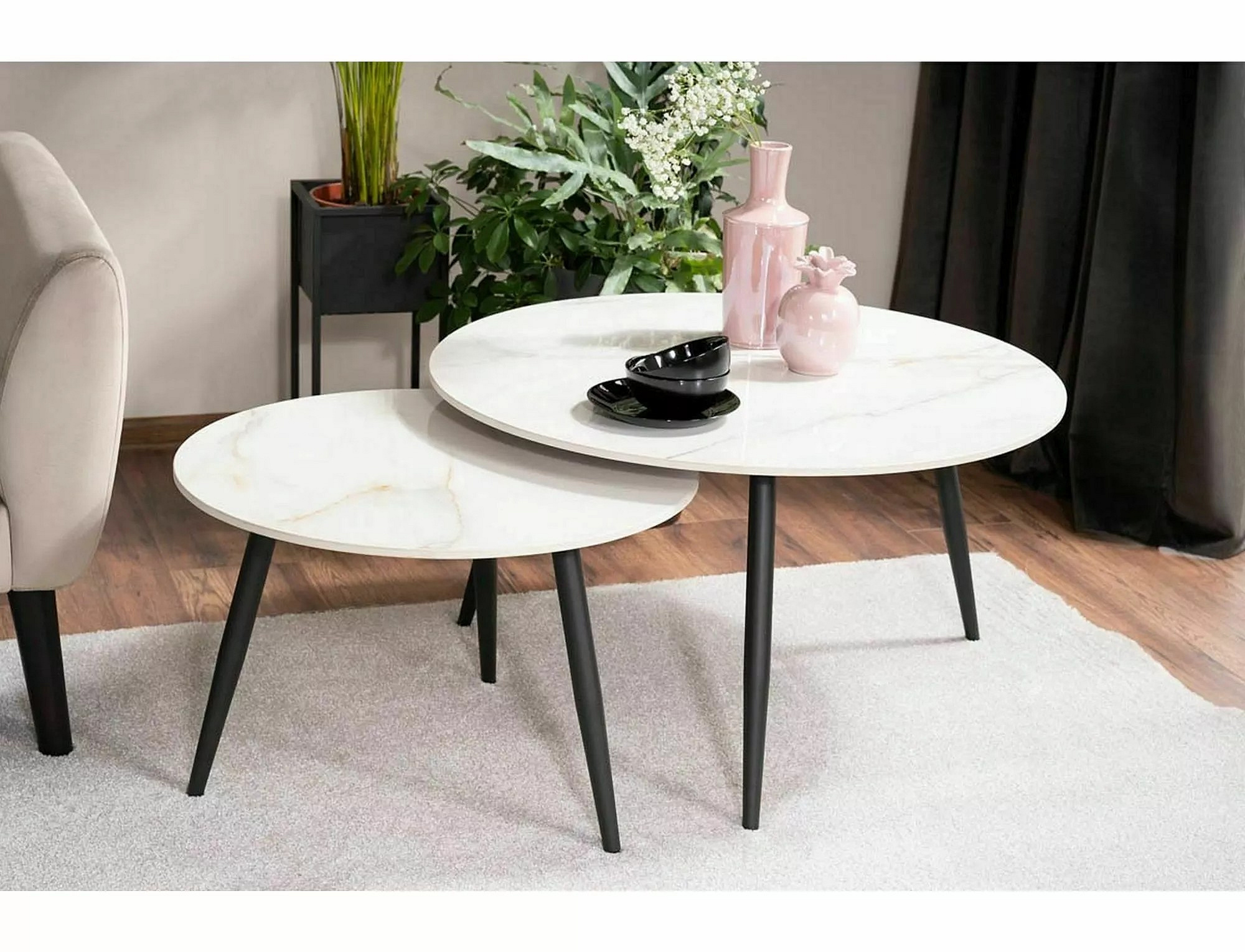 Set konferenčních stolků KORA D je vyroben z vysoce kvalitní keramiky a kovu, což zajišťuje jeho dlouhou životnost a odolnost. Keramická deska stolu je nejen esteticky přitažlivá, ale také praktická, protože je snadno udržovatelná a odolná vůči poškrábání. Kovová konstrukce v černém matu dodává stolku moderní a industriální vzhled, který se hodí do každého moderního interiéru.