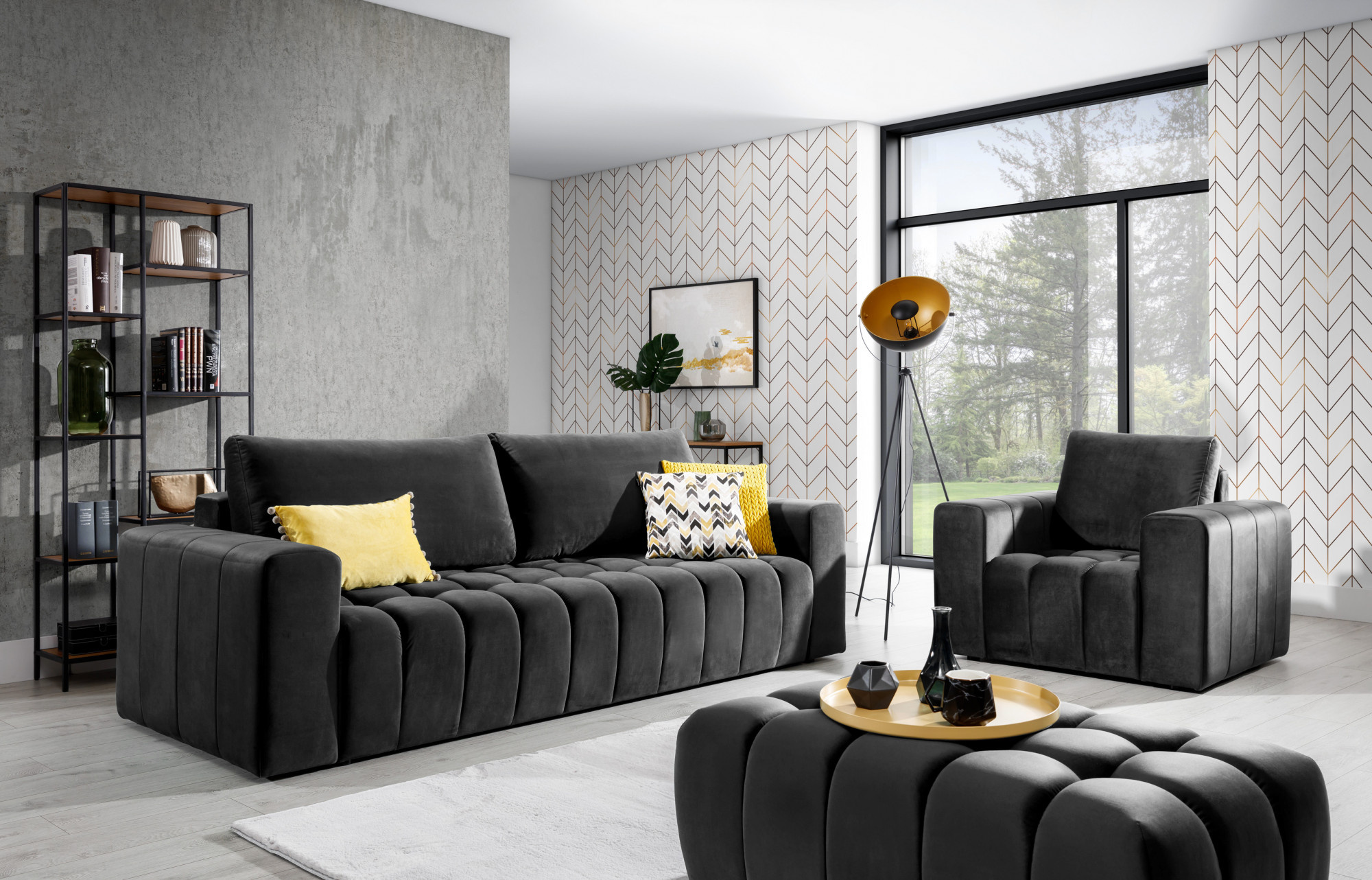Sada nábytku Lazaro je stylový kousek, který vylepší zážitek z vkusného interiérového designu, ovlivňující jak estetické pocity, tak maximální pohodlí a komfort. Taková sada udělá z trávení času doma skutečné potěšení. Naše nábytek jistě upoutá pozornost stylovým prošíváním na sedáku a šitím na stranách. Charakteristické rysy naší pohovky, která měří 245 x 97 x 85 cm, zahrnují: originální sedák, vyplněný kombinací pěny T25 a HR pěny, tvarované opěradlo, široké područky a širokou škálu barevných možností při výběru nábytku. Je také třeba poznamenat, že pohovku lze velmi snadno a rychle přeměnit na spací plochu o rozměrech 195 x 125 cm. Je doplněn úložným prostorem na lůžkoviny, který je podporován automatickým systémem rozkládání DL. Nelze také nezmínit křeslo a taburet. Rozměry prvního: 108 x 89 x 85, stejně jako druhého: 102 x 64 x 40 cm, umožňují jejich umístění do místností různé velikosti. Za zmínku také stojí, že naše puf je multifunkční, protože se může proměnit v další sedací plochu, pohodlnou opěrku nohou nebo stůl. Pohodlná sedadla jsou vyrobena z vlnité pružiny a pěny HR+T21, takže nejvyšší komfort při používání našeho nábytku je 100% zaručen. Sada Lazaro je ztělesněním dobrého stylu a vkusu. Určitě stojí za to mít to ve svém bytě,
