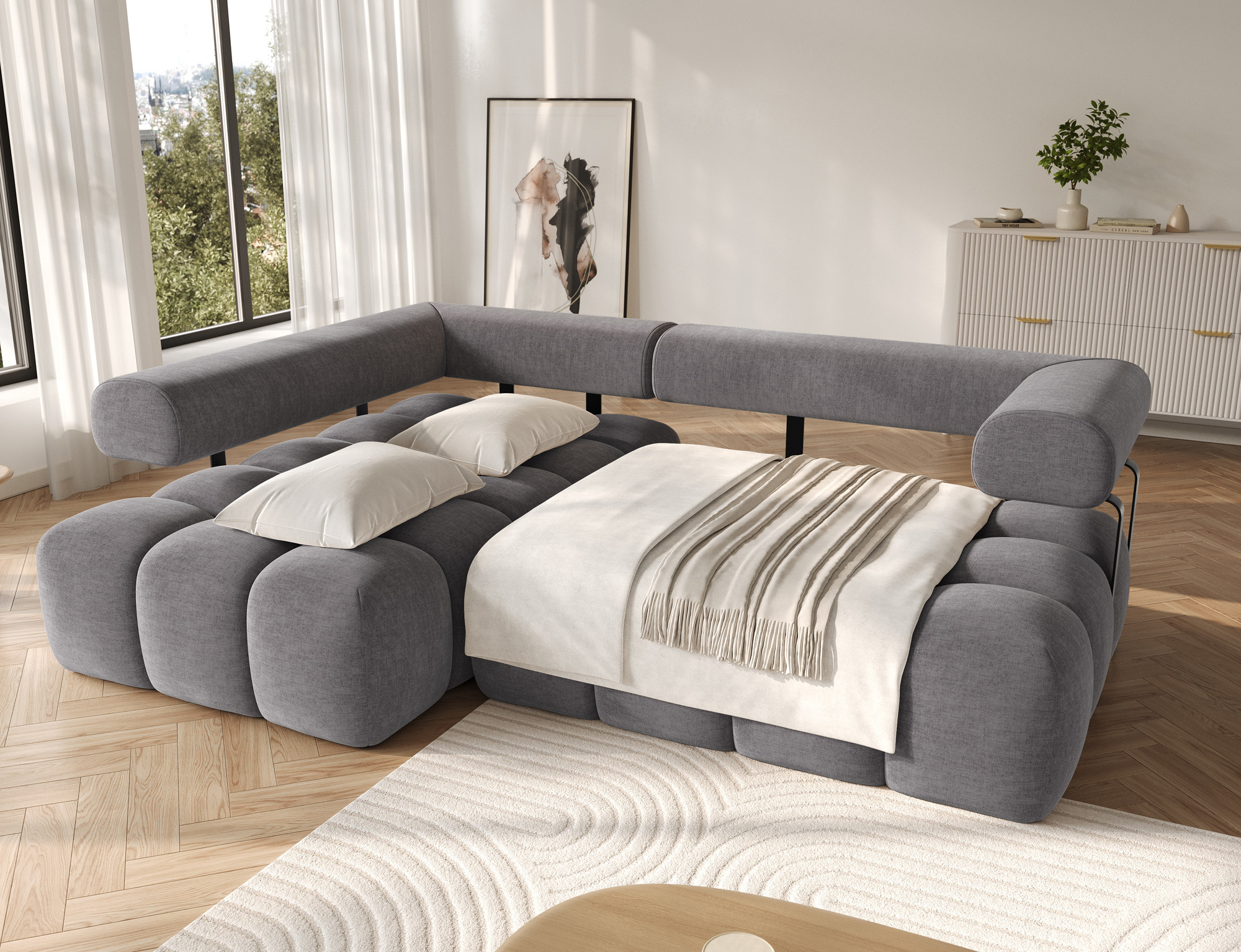 Jednou z hlavních předností této sedací soupravy je její rozkládací funkce. Snadno ji přeměníte na pohodlné lůžko s plochou na spaní 110 x 187 cm, což je ideální pro nečekané hosty nebo pro ty, kteří si rádi dopřejí odpolední siestu. Díky této funkci se stává skvělou volbou pro menší byty, kde je třeba efektivně využít každý centimetr prostoru.