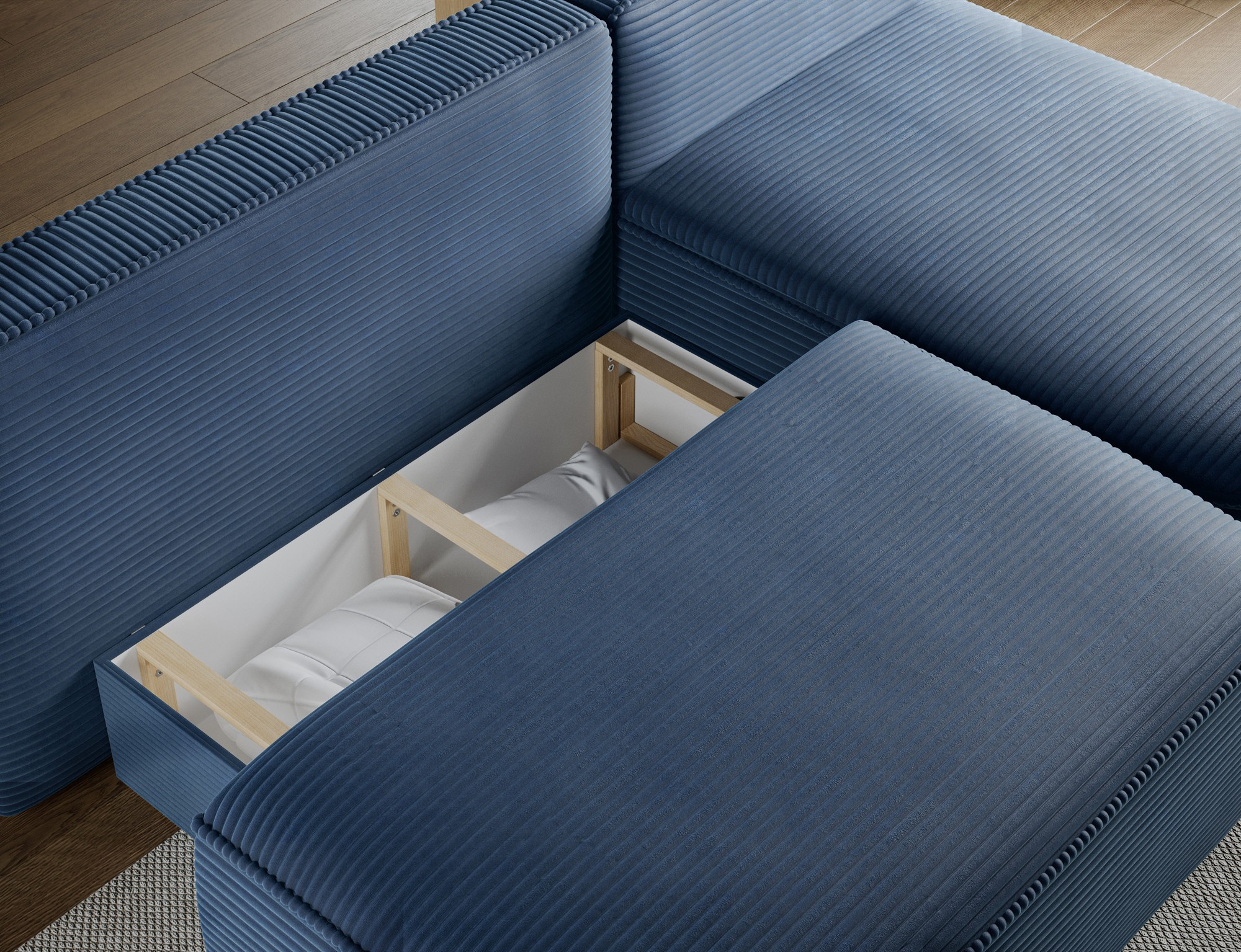 Další praktickou vlastností je úložný prostor, který je diskrétně integrován do konstrukce soupravy. Tento prostor je ideální pro uskladnění lůžkovin, polštářů nebo dalších předmětů, které chcete mít po ruce, ale zároveň je mít úhledně uklizené.
