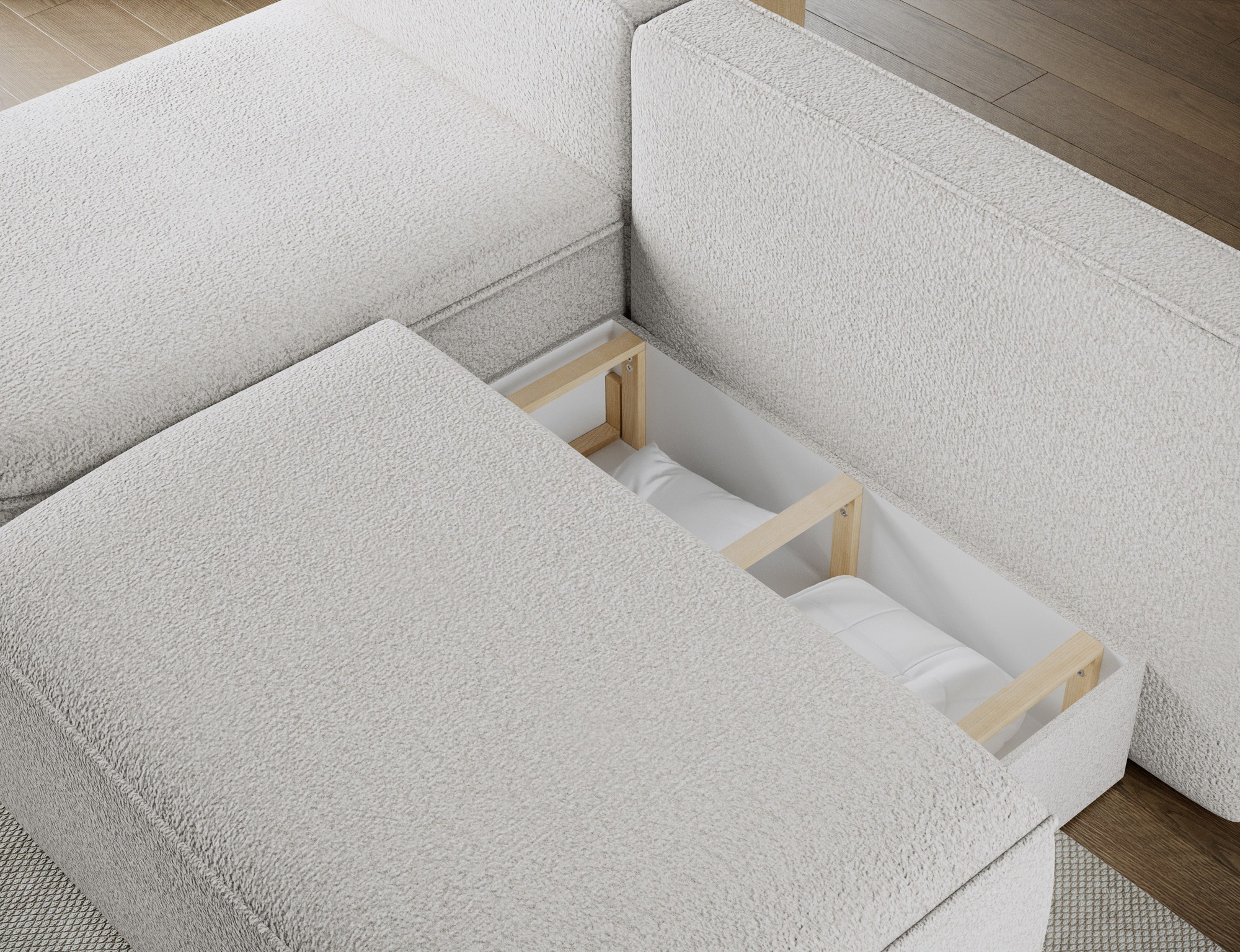 Další praktickou vlastností je úložný prostor, který je diskrétně integrován do konstrukce soupravy. Tento prostor je ideální pro uskladnění lůžkovin, polštářů nebo dalších předmětů, které chcete mít po ruce, ale zároveň je mít úhledně uklizené.