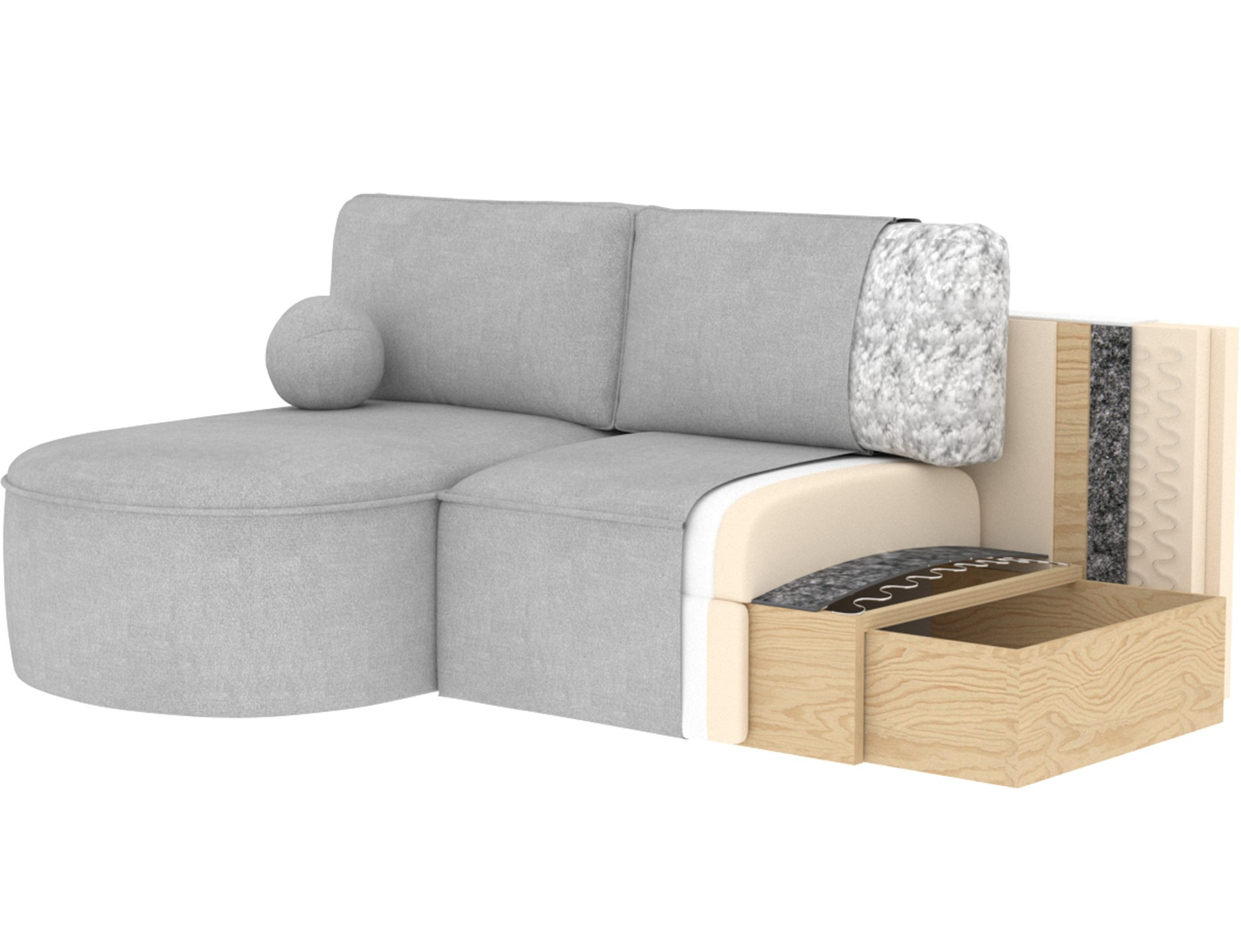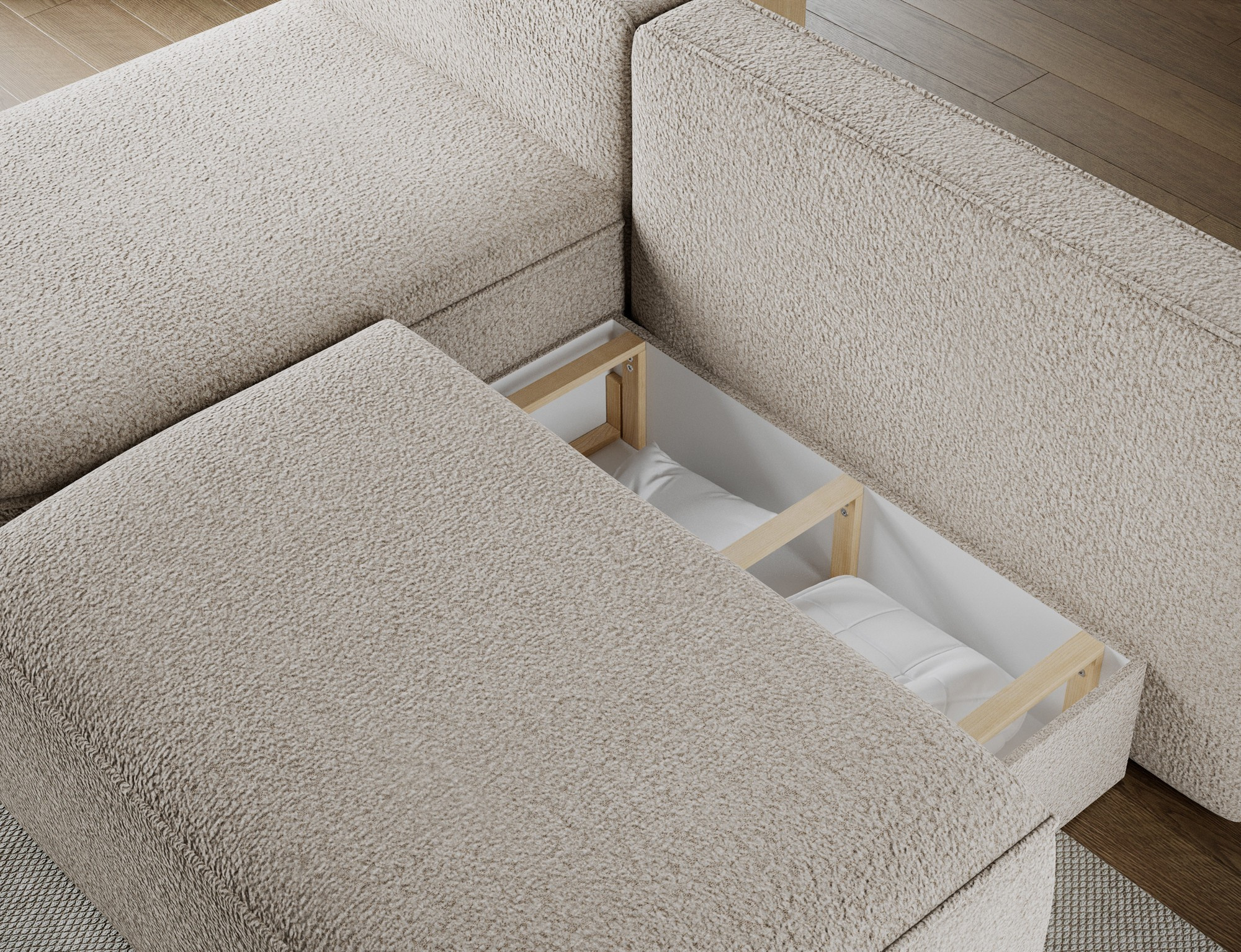 Další praktickou vlastností je úložný prostor, který je diskrétně integrován do konstrukce soupravy. Tento prostor je ideální pro uskladnění lůžkovin, polštářů nebo dalších předmětů, které chcete mít po ruce, ale zároveň je mít úhledně uklizené.