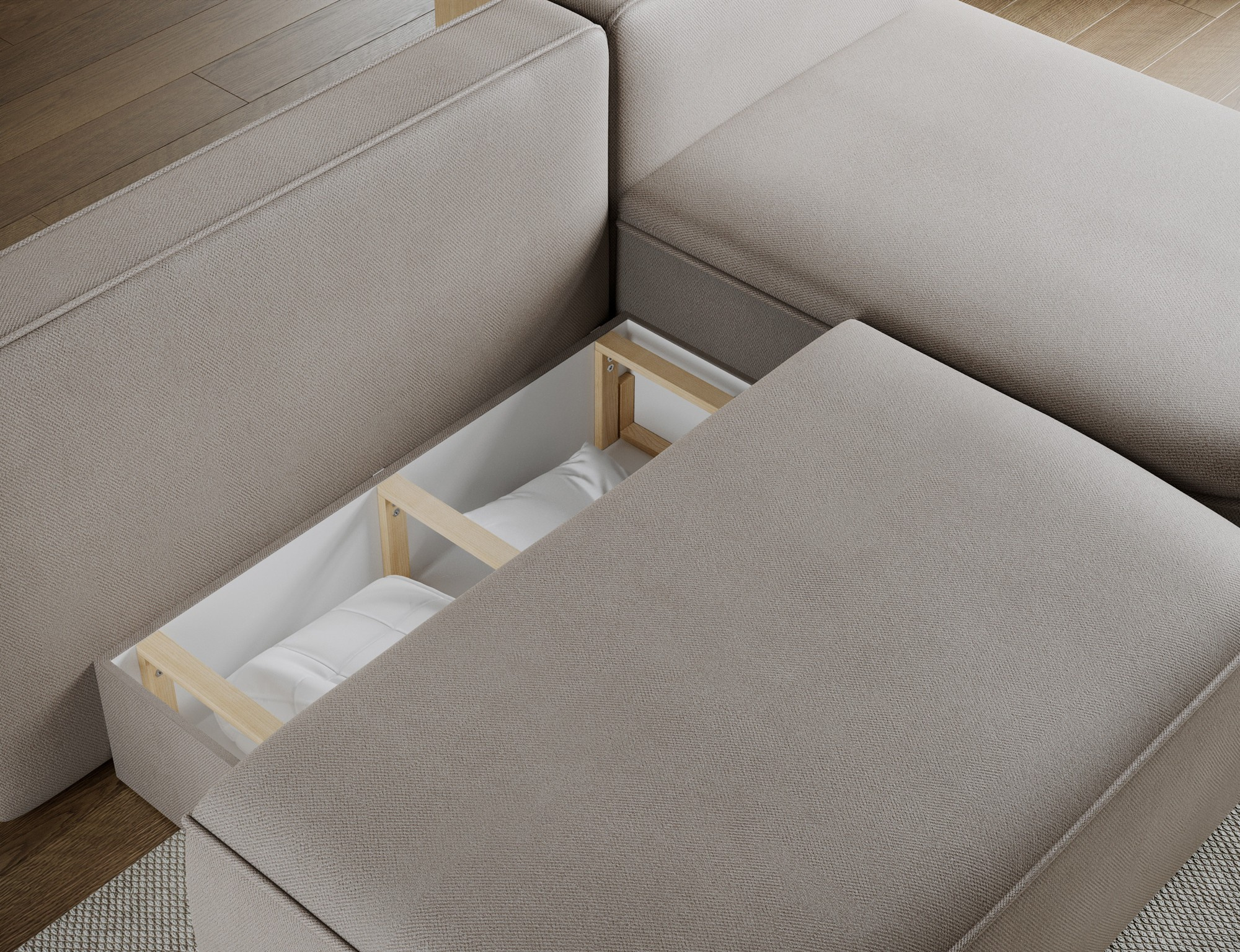 Další praktickou vlastností je úložný prostor, který je diskrétně integrován do konstrukce soupravy. Tento prostor je ideální pro uskladnění lůžkovin, polštářů nebo dalších předmětů, které chcete mít po ruce, ale zároveň je mít úhledně uklizené.