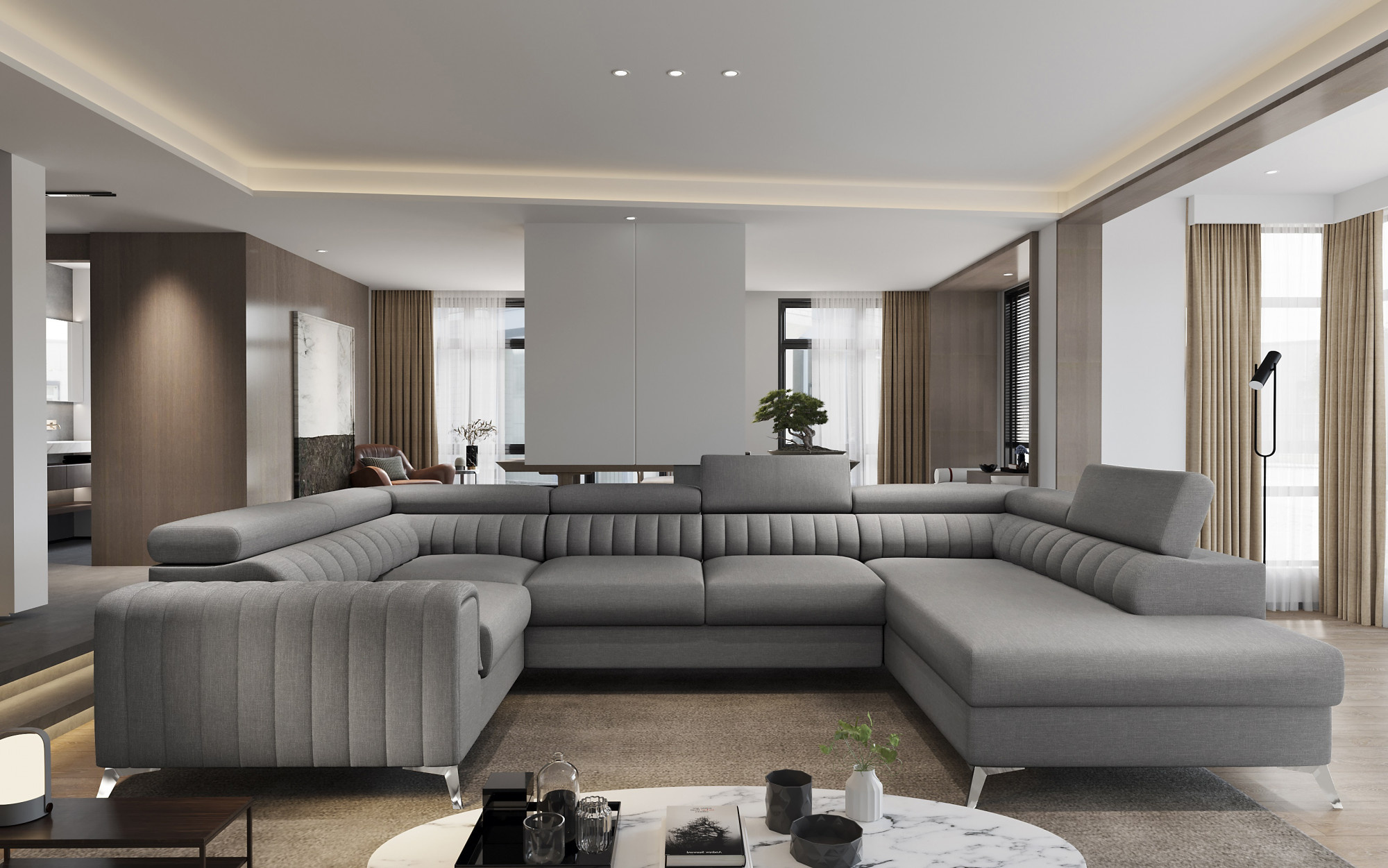 Sedací souprava LOUIS se pyšní moderním designem, který se snadno začlení do jakéhokoli interiéru. Její elegantní linie a jemný povrch dodávají prostoru nádech luxusu. S šířkou 347 cm, výškou 92 cm a hloubkou 202 cm nabízí dostatek prostoru pro celou rodinu i přátele. Výška sedu 45 cm je ideální pro pohodlné sezení, ať už relaxujete s knihou, sledujete oblíbený film nebo hostíte návštěvu.