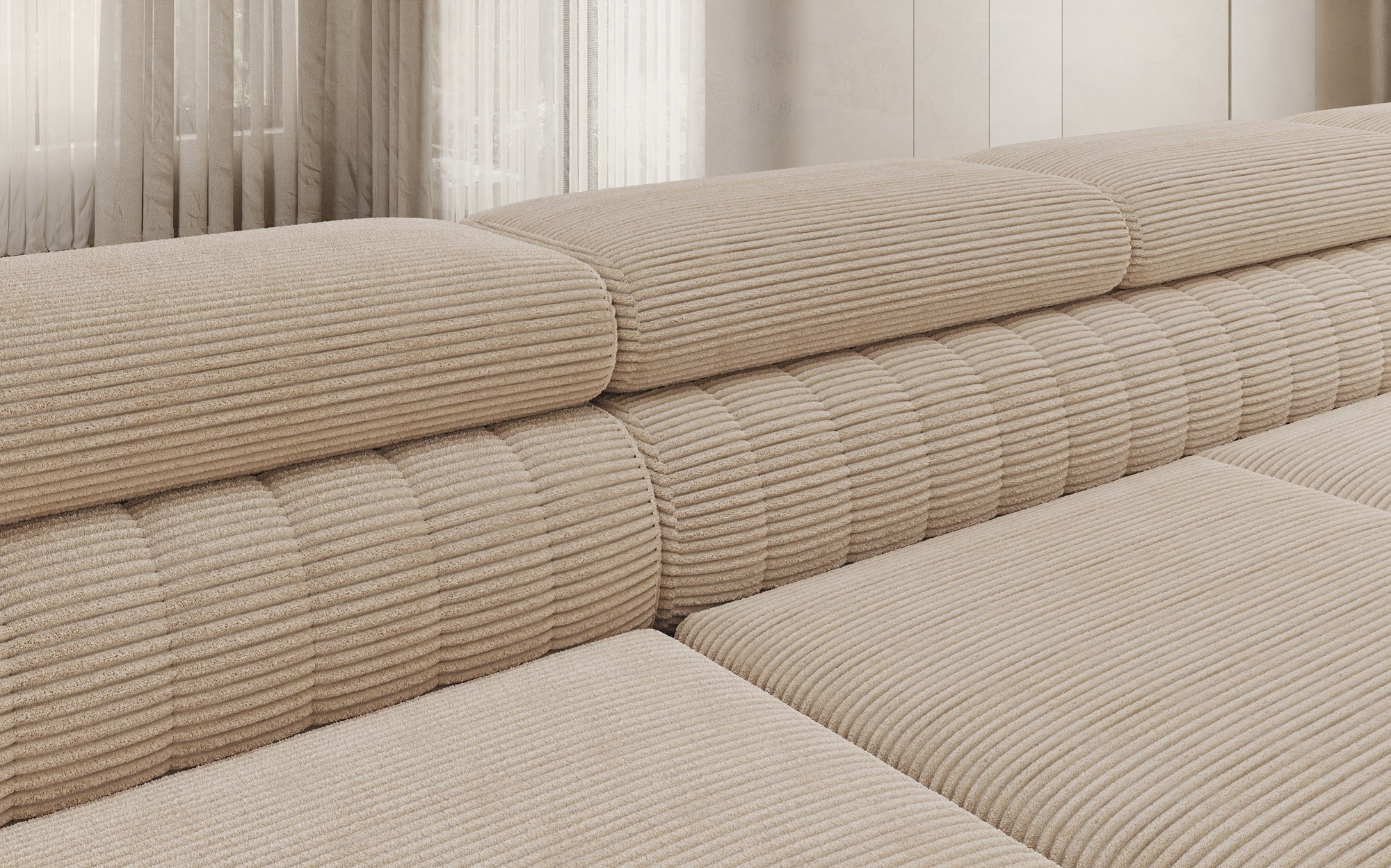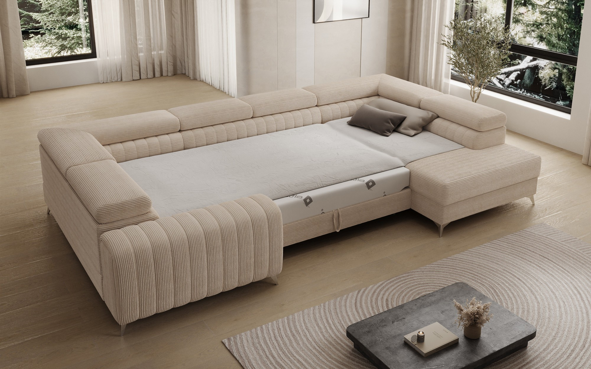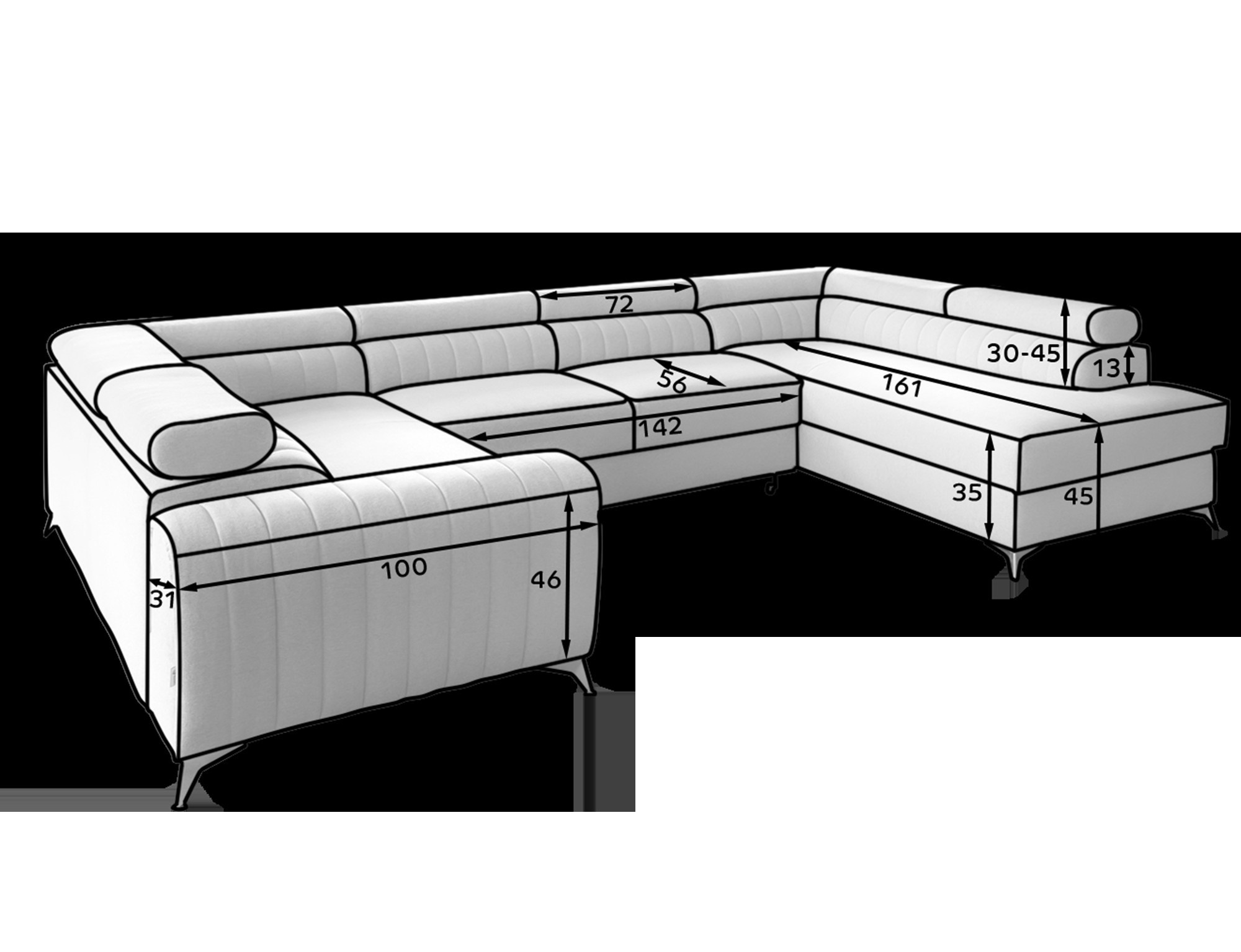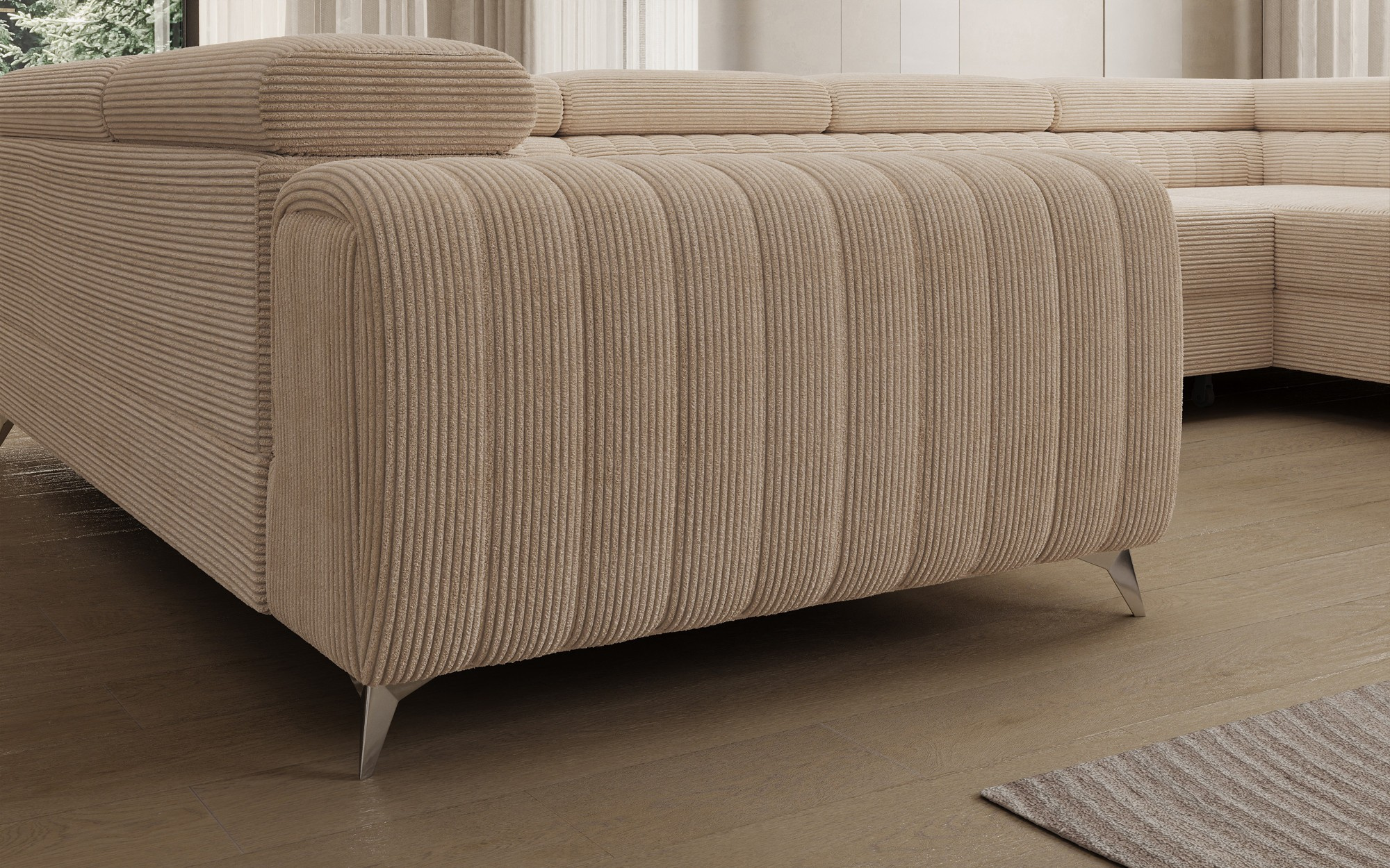 Rohová pohovka Louis je pohodlná, stylová a především funkční. Sedák se skládá z vlnových pružin a výplně z T30 a vysoce pružné HR pěny, která se dokonale přizpůsobí tělu a zvyšuje komfort. Rozměry rohové pohovky Louis — 347 x 202 x 92 cm — dále zvyšují úroveň pohodlí. Mezi jeho výhody patří čtyři nastavitelné opěrky hlavy, úložný prostor na lůžkoviny a velká spací plocha o rozměrech 254 x 123 cm. Kromě toho je mechanismus rozkládání „delfín“ použitý v tomto kusu jednoduchý a intuitivní. Můžete si také vybrat barvu čalounění rohové pohovky Louis z palety látkové kolekce Eltap. Designové nohy pohovky také stojí za zmínku — jsou vyrobeny z oceli, pochromované a vysoké, což dodává nábytku elegantní nádech. Estetické kvality jsou dále zdůrazněny vertikálním prošíváním na boku a zadní části pohovky Louis.