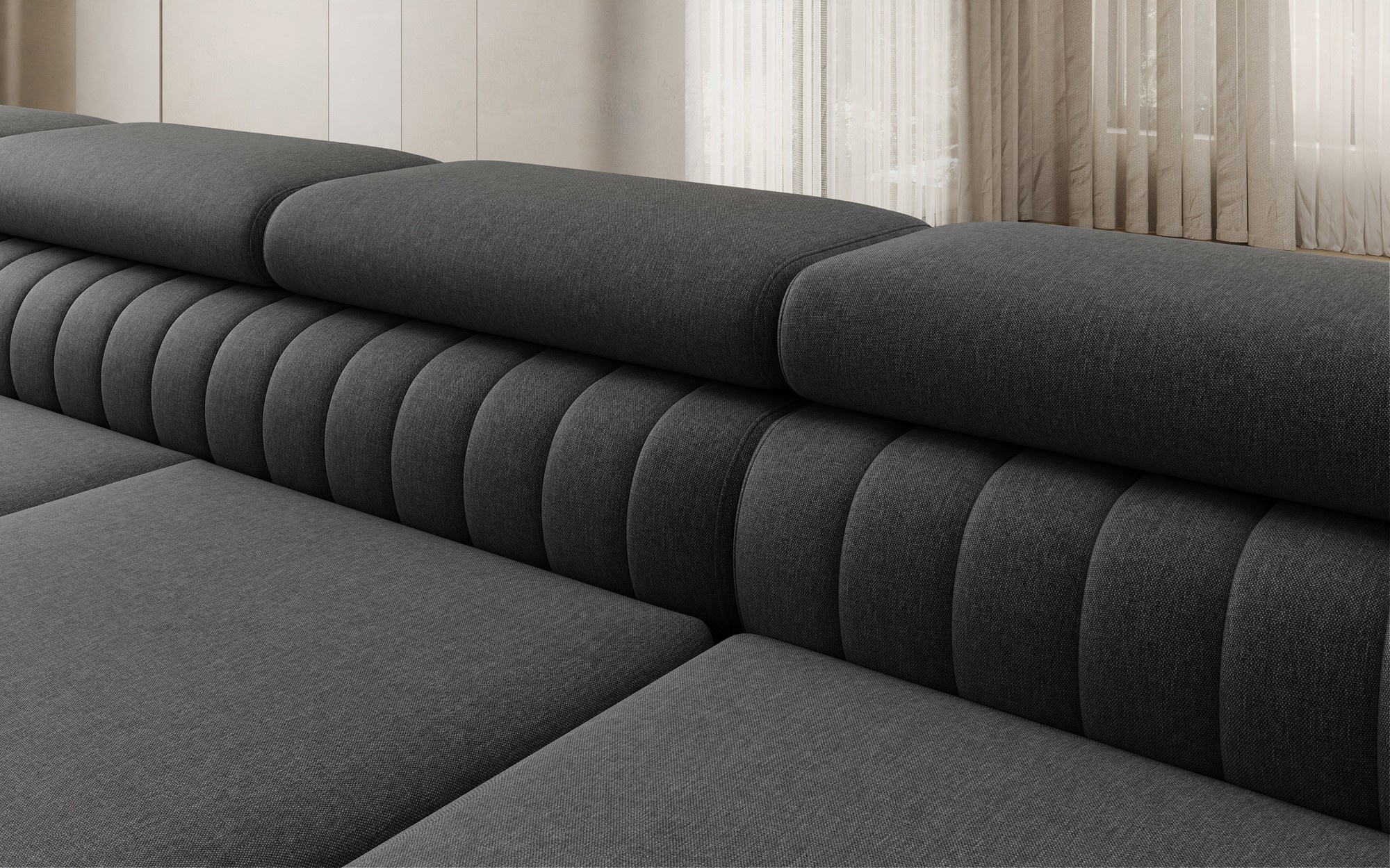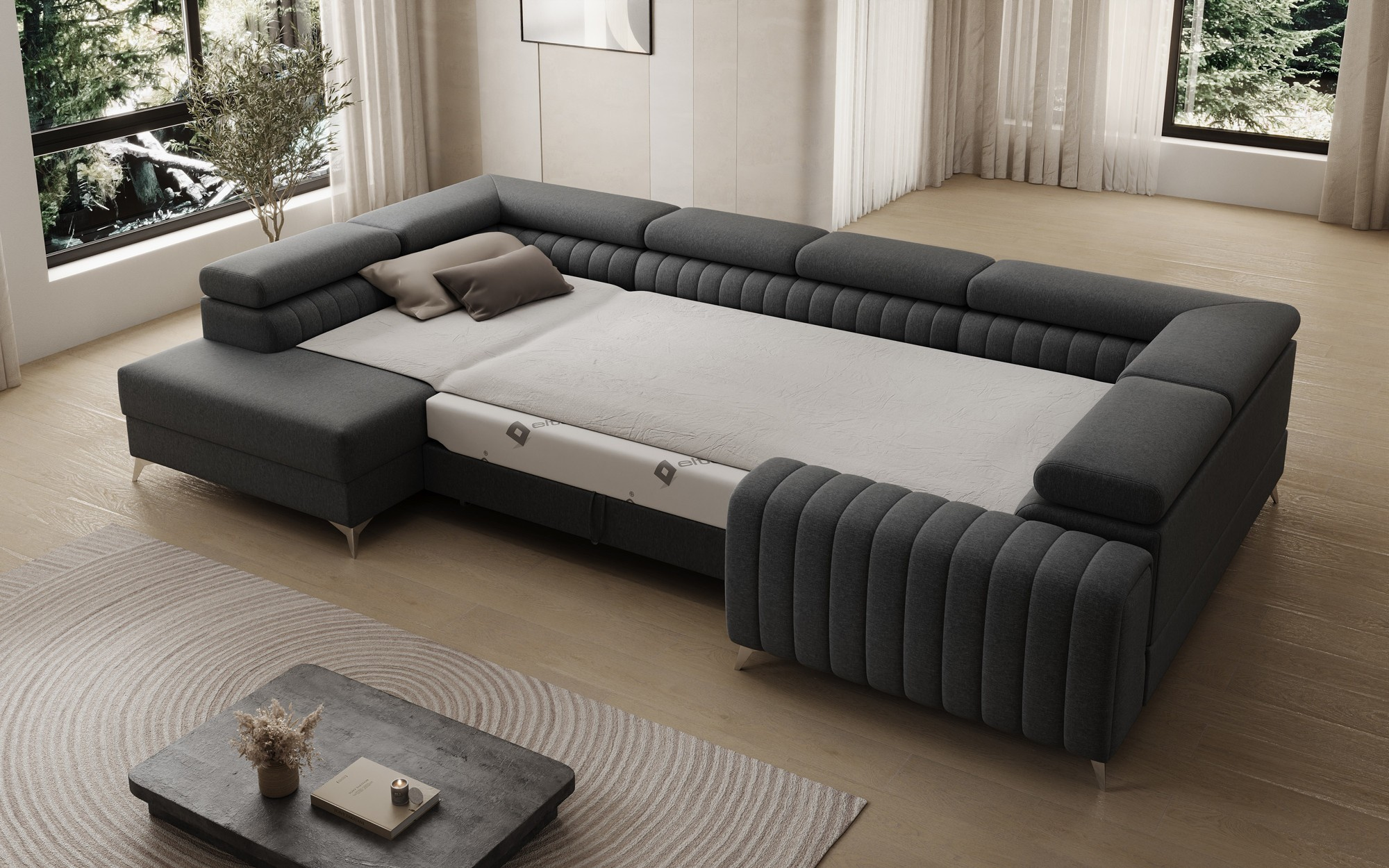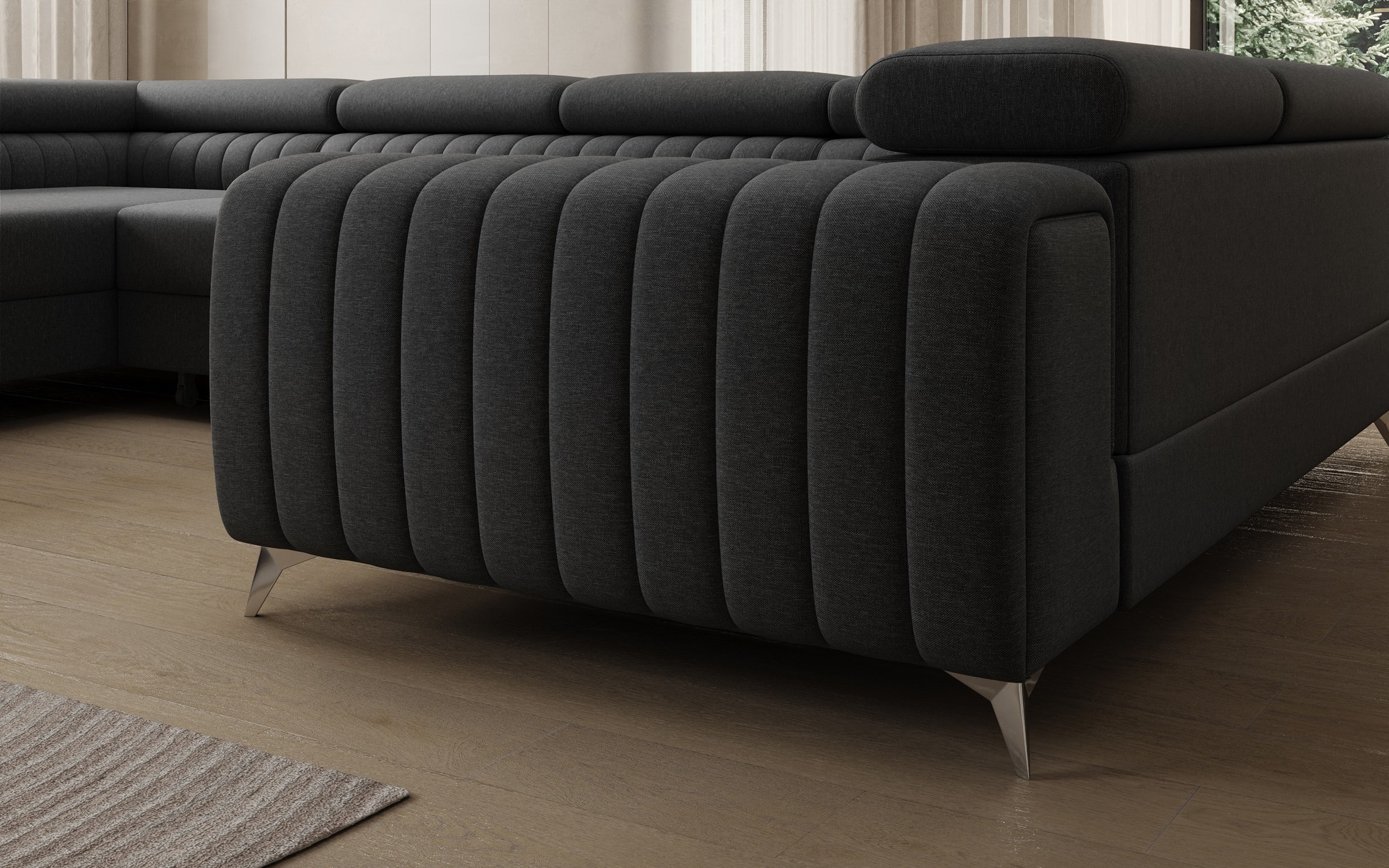 Rohová pohovka Louis je pohodlná, stylová a především funkční. Sedák se skládá z vlnových pružin a výplně z T30 a vysoce pružné HR pěny, která se dokonale přizpůsobí tělu a zvyšuje komfort. Rozměry rohové pohovky Louis — 347 x 202 x 92 cm — dále zvyšují úroveň pohodlí. Mezi jeho výhody patří čtyři nastavitelné opěrky hlavy, úložný prostor na lůžkoviny a velká spací plocha o rozměrech 254 x 123 cm. Kromě toho je mechanismus rozkládání „delfín“ použitý v tomto kusu jednoduchý a intuitivní. Můžete si také vybrat barvu čalounění rohové pohovky Louis z palety látkové kolekce Eltap. Designové nohy pohovky také stojí za zmínku — jsou vyrobeny z oceli, pochromované a vysoké, což dodává nábytku elegantní nádech. Estetické kvality jsou dále zdůrazněny vertikálním prošíváním na boku a zadní části pohovky Louis.