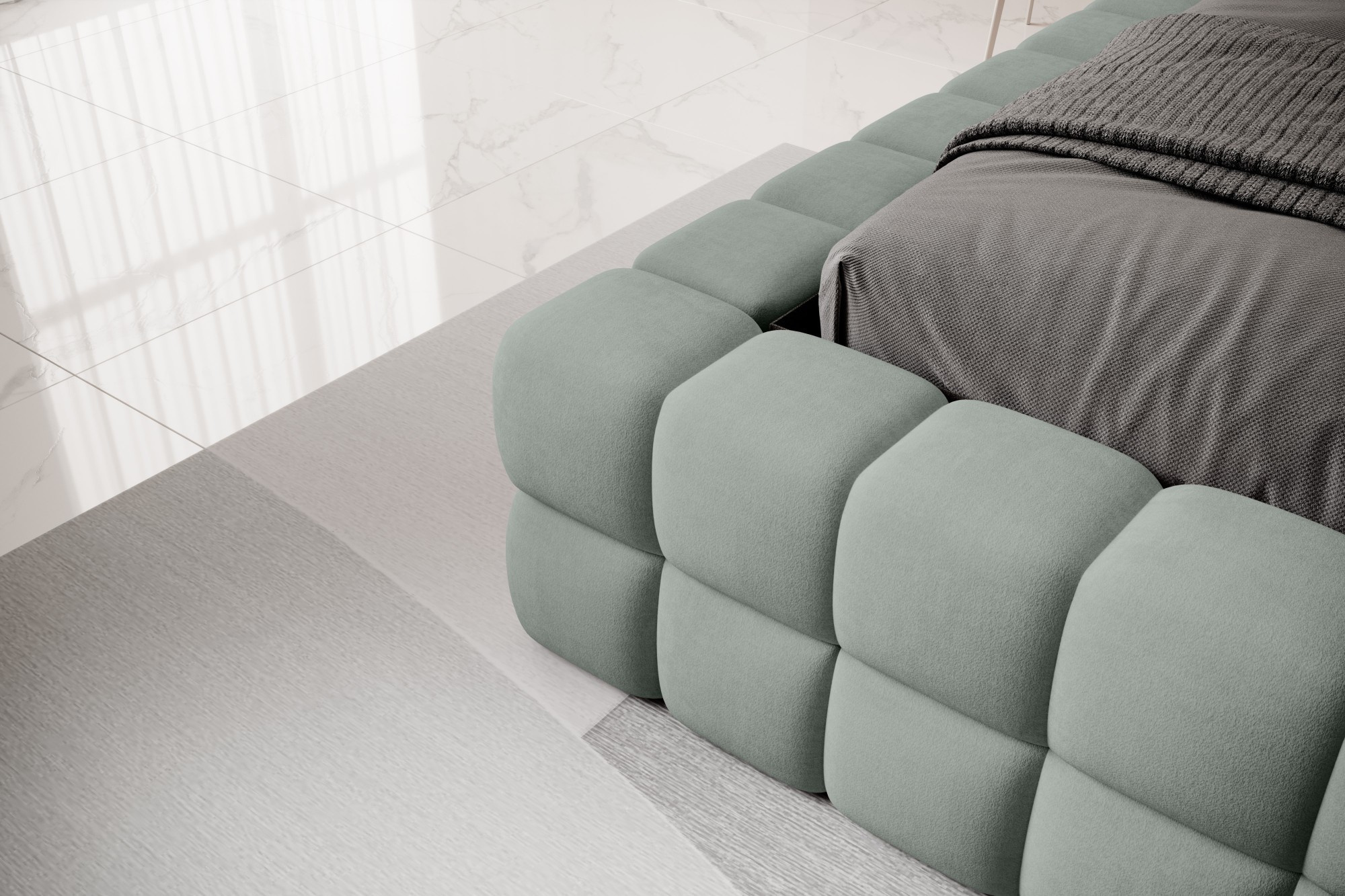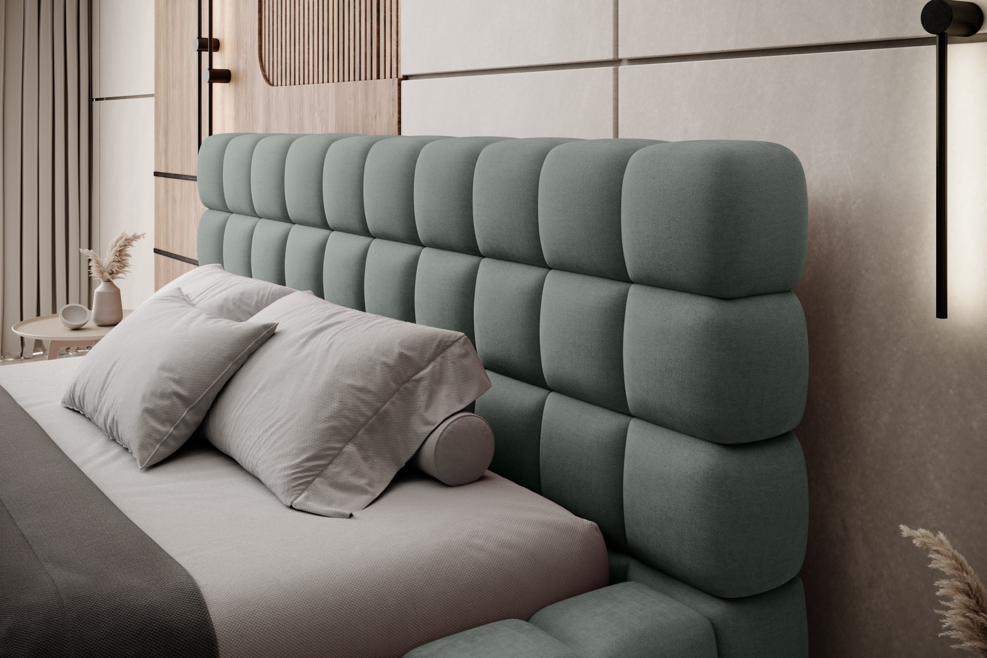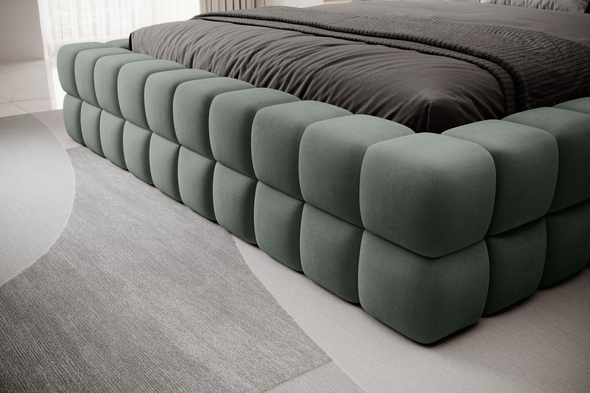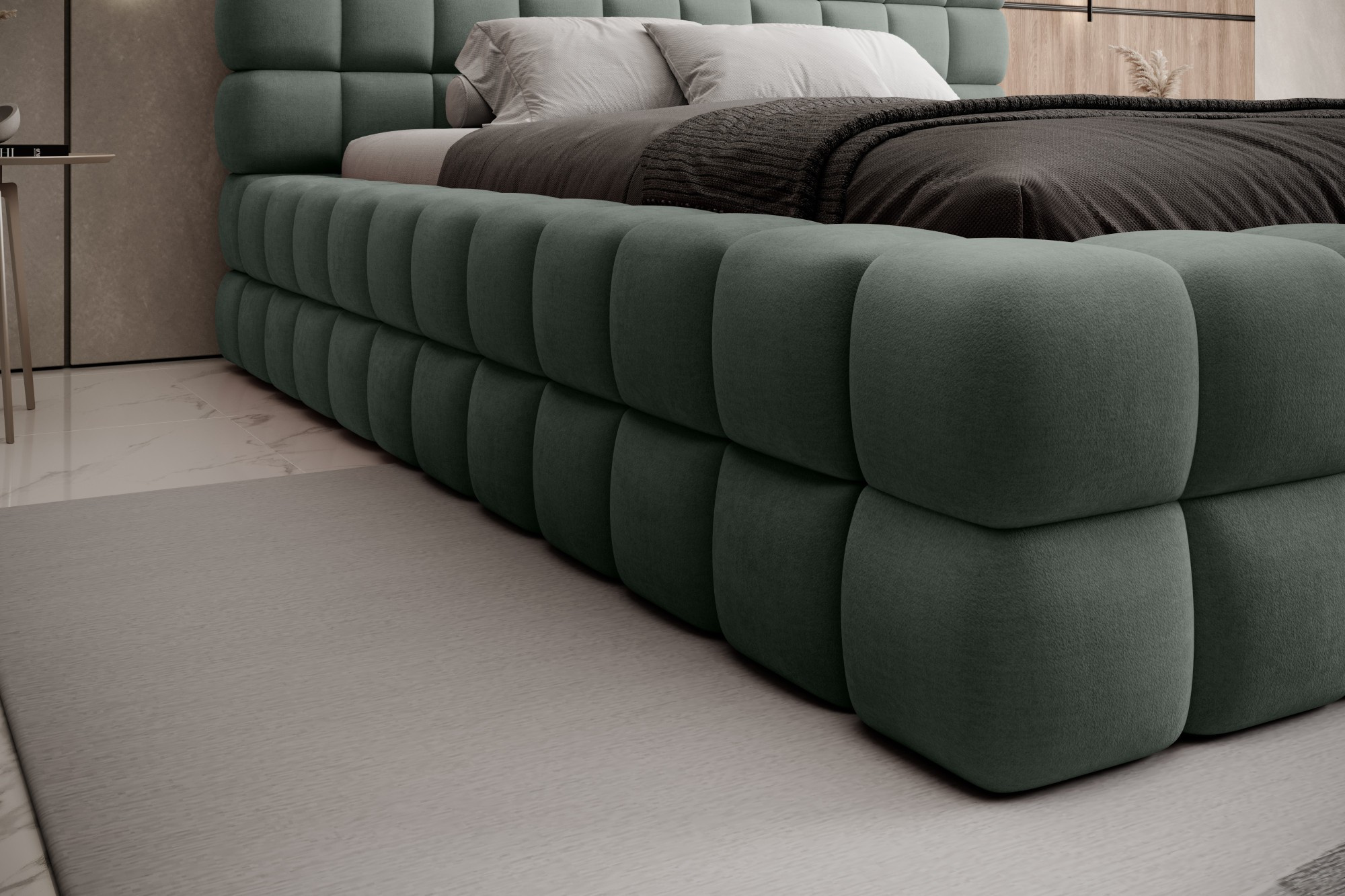 Postel Dizzle ve verzi se šířkou 140 cm je ideálním řešením pro ty, kteří si cení kompaktních rozměrů, aniž by museli slevit z pohodlí při spánku. Tato postel kombinuje moderní design s funkčností. Používá pěnu T2130, která zajišťuje pružnost a pohodlí. Se třemi různými možnostmi šířky poskytuje volba 140 cm optimální prostor pro relaxaci. Délka postele je 225 cm a její impozantní výška 104 cm jí dodává elegantní vzhled.Výška sedadla je 42 cm; nezapomeňte však přidat výšku matrace, abyste dosáhli plného pohodlí při spánku. Černé plastové nohy s výškou 2 cm zajišťují stabilitu. Kovový rám zaručuje odolnost konstrukce a jedna úložná přihrádka činí postel Dizzle 140 také praktickým místem pro uložení dalších předmětů.S 36 lamelami pro rovnoměrnou podporu matrace přináší postel Dizzle, jejíž tvar připomíná elegantní kostku, do vaší ložnice jedinečný design a pohodlnou relaxaci.