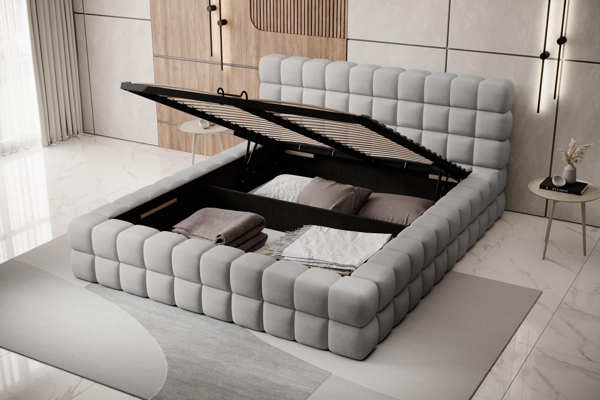 Postel Dizzle ve verzi s impozantní šířkou 180 cm je ideálním řešením pro ty, kteří touží po ještě větším prostoru pro spánek, aniž by obětovali eleganci a pohodlí. Využívá pěnu T2130, která poskytuje pružnost a jedinečný spánkový komfort. Se třemi různými možnostmi šířky je 180 cm návrhem pro nadšence prostornosti. Délka postele je 225 cm a její impozantní výška 104 cm dodává celé konstrukci eleganci.Výška sedáku je 42 cm; doporučuje se však přidat výšku matrace pro plný komfort při používání. Černé plastové nohy s výškou 2 cm zajišťují stabilitu. Kovový rám zaručuje odolnost konstrukce a jedna úložná přihrádka činí postel Dizzle 180 praktickým místem pro uložení dalších věcí.S 36 lamelami pro rovnoměrnou podporu matrace přináší postel Dizzle, jejíž tvar připomíná elegantní kostku, do vaší ložnice nejen prostornost, ale také stylový design a pohodlnou relaxaci.