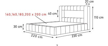 Délka: 230 cm Výška čela: 90 cm Výška sedáku: 30 cm Plocha na spaní: 160/200 cm Postel má kovový rám, LED osvětlení a úložný prostor na ložní prádlo