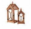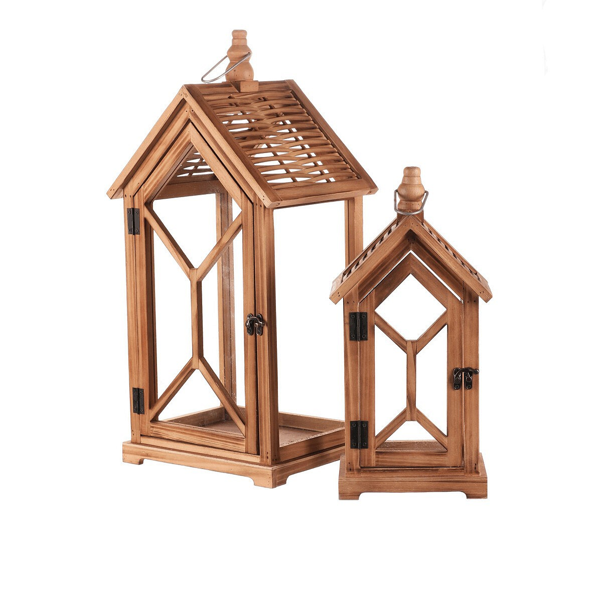 Dřevěná lucerna ve tvaru domku v sadě dvou různě velkých kusů se skvěle hodí do každého interiéru i exteriéru. Celodřevěná konstrukce v přírodní barvě je doplněna velkými čirými skly na všech stranách, která umožňují plně vychutnat světlo svíčky. Elegantní dvířka přidávají na praktičnosti, zatímco malé kovové madlo na střeše umožňuje snadné přenášení.