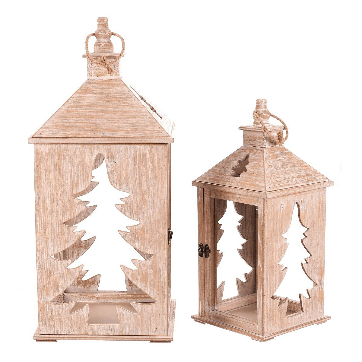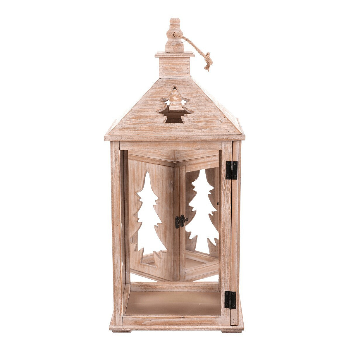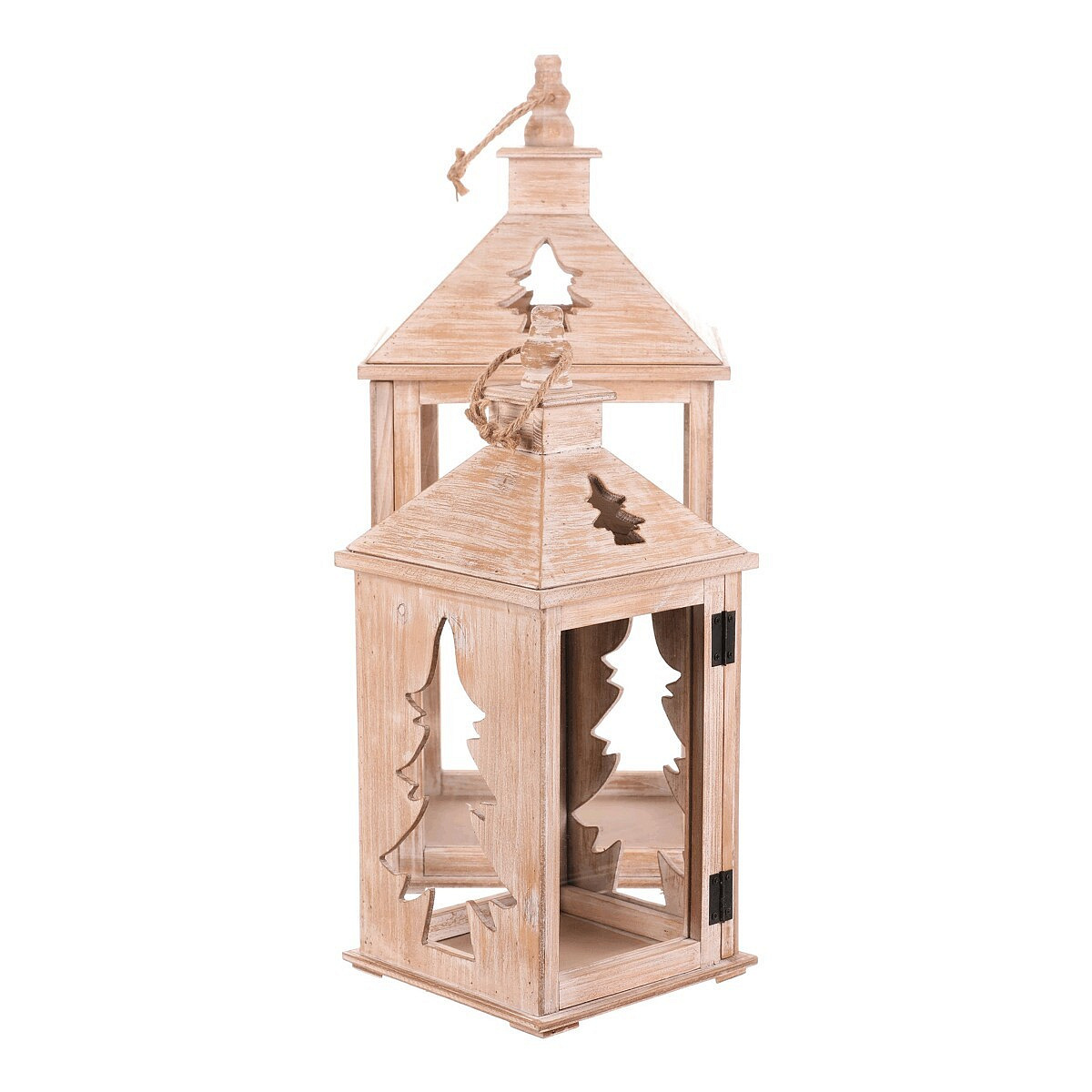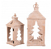 Dřevěná čtyřboká lucerna s jemně vyběleným povrchem je dokonalým doplňkem pro období Vánoc a zimy. Dvě strany zdobí vyřezaný motiv jehličnanu, který po vložení svíčky vytváří působivý světelný efekt. Lucerna je vybavena kroužkem na pověšení a je k dispozici v sadě dvou velikostí. Ideální pro zpříjemnění dlouhých zimních večerů.