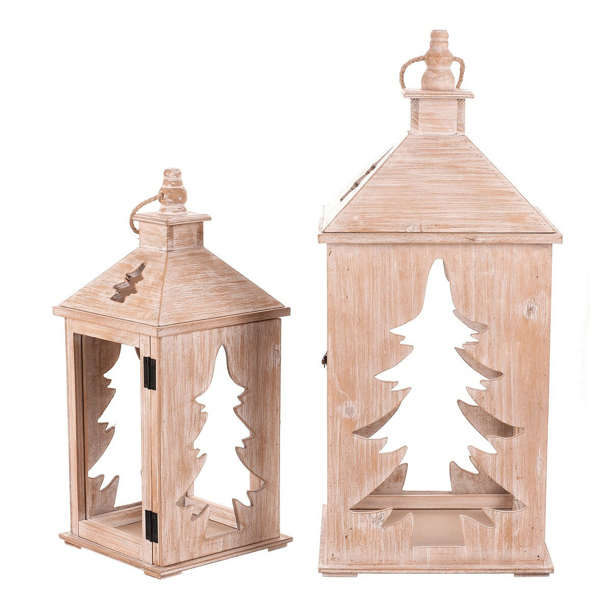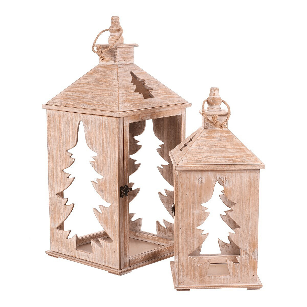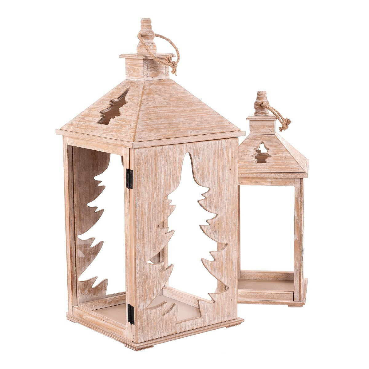 Dřevěná čtyřboká lucerna s jemně vyběleným povrchem je dokonalým doplňkem pro období Vánoc a zimy. Dvě strany zdobí vyřezaný motiv jehličnanu, který po vložení svíčky vytváří působivý světelný efekt. Lucerna je vybavena kroužkem na pověšení a je k dispozici v sadě dvou velikostí. Ideální pro zpříjemnění dlouhých zimních večerů.