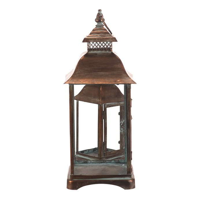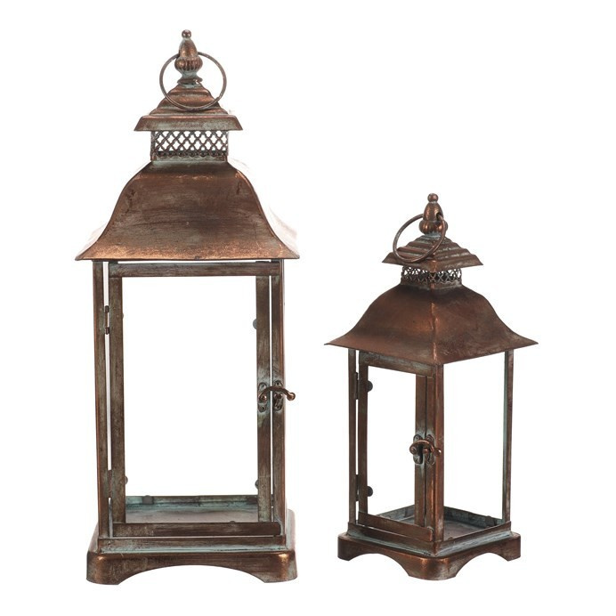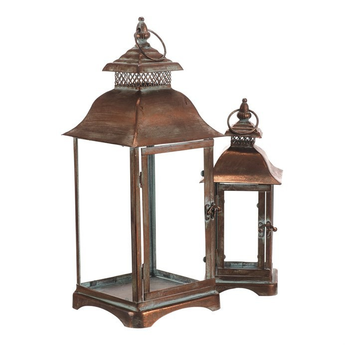 Sada dvou kovových luceren v měděném odstínu přináší do interiéru nebo exteriéru tradiční atmosféru s nádechem vintage stylu. Čtyřboké provedení s průhlednými skleněnými stěnami umožňuje rovnoměrné rozptýlení světla svíčky uvnitř. Lucerny jsou vybaveny praktickým otevíracím dvířkem a horním kovovým kroužkem pro snadné přenášení nebo zavěšení. Robustní kovová základna zajišťuje stabilitu a dlouhou životnost. Hodí se pro dekorativní osvětlení na terasu, balkon či do obývacího pokoje.