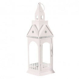 Čtyřboká kovová lucerna v bílé barvě, která připomíná věž kostela, bude současně skvělým ozdobným prvkem i zdrojem světla. Všechny stěny jsou z čirého skla, které tvoří většinu povrchu a dodávají lucerně na elegantním vzhledu. Lze ji postavit na stůl, okenní parapet, případně jiné vyvýšené místo. Díky kovovému oku v horní části nad stříškou, ji lze taktéž pověsit, například na strop altánku, pergoly a další místa, a získat tím nádherný zdroj přirozeného světla z vložené svíčky. Po zapálení knotu, budou neodolatelně pronikat paprsky světla všemi směry ven, a vy si budete moci naplno vychutnávat chvíle pohody a relaxace.