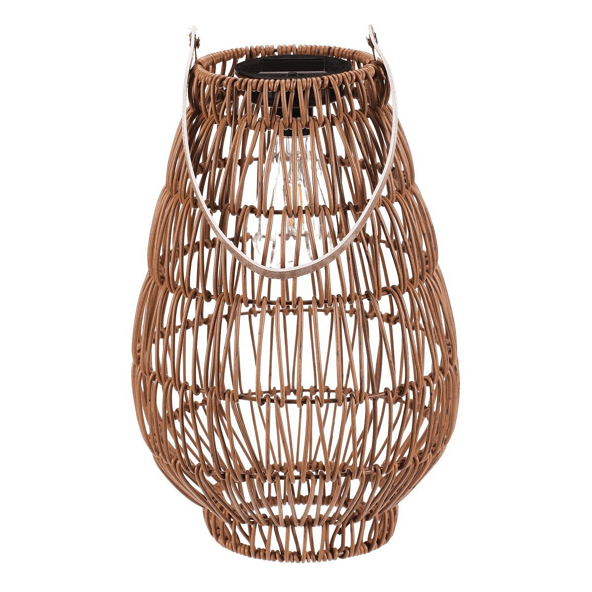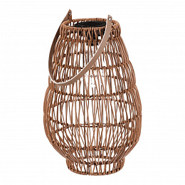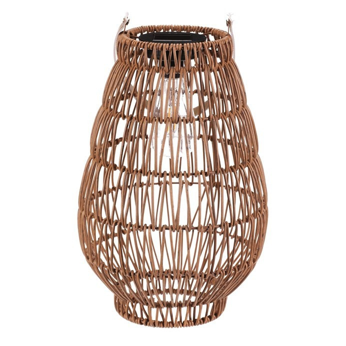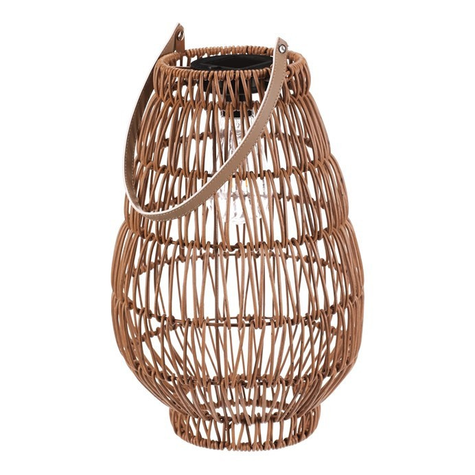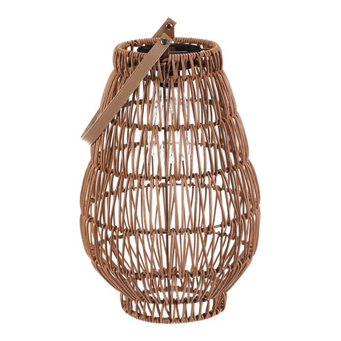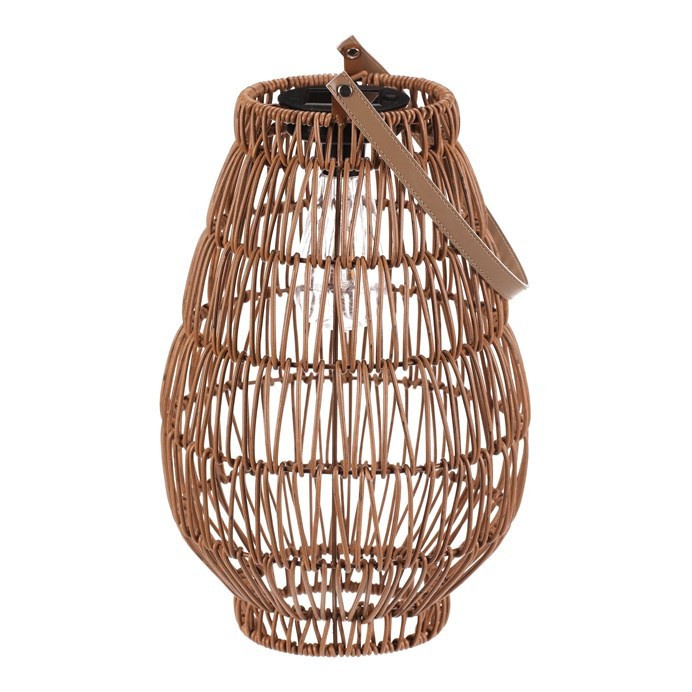 Lampión z polyratanu v příjemném světle hnědém odstínu má tvar hrušky a je vybaven LED osvětlením, které vytváří jemnou atmosféru. Provedení lampiónu je otevřené s výraznou strukturou připomínající ruční pletení, což zajišťuje zajímavý vizuální efekt světla. Praktický kožený úchyt umožňuje snadné přenášení nebo zavěšení. Velikost L poskytuje dostatek prostoru pro umístění LED zdroje uvnitř. Lampión je vhodný pro dekorativní osvětlení interiérů i venkovních prostor. LED osvětlení je napájeno 1 x AA dobíjecí baterií a zároveň solárním panelem umístěným na horní hraně.