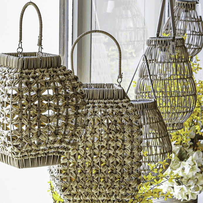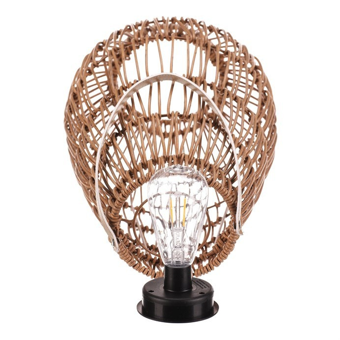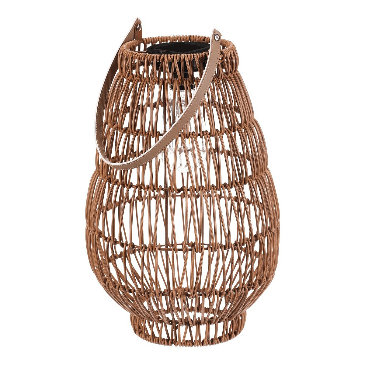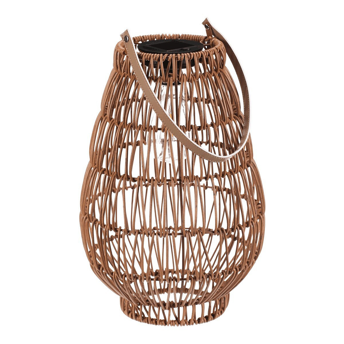 Lampión z polyratanu v příjemném světle hnědém odstínu má tvar hrušky a je vybaven LED osvětlením, které vytváří jemnou atmosféru. Provedení lampiónu je otevřené s výraznou strukturou připomínající ruční pletení, což zajišťuje zajímavý vizuální efekt světla. Praktický kožený úchyt umožňuje snadné přenášení nebo zavěšení. Velikost L poskytuje dostatek prostoru pro umístění LED zdroje uvnitř. Lampión je vhodný pro dekorativní osvětlení interiérů i venkovních prostor. LED osvětlení je napájeno 1 x AA dobíjecí baterií a zároveň solárním panelem umístěným na horní hraně.